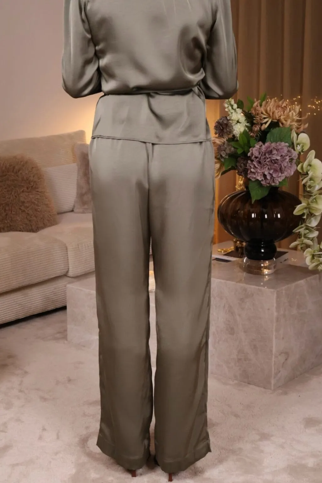 Satinbukser fra Valentin Studio i en armygrøn nuance. Bukserne har en løs pasform og en skinnende overflade med et blødt fald.