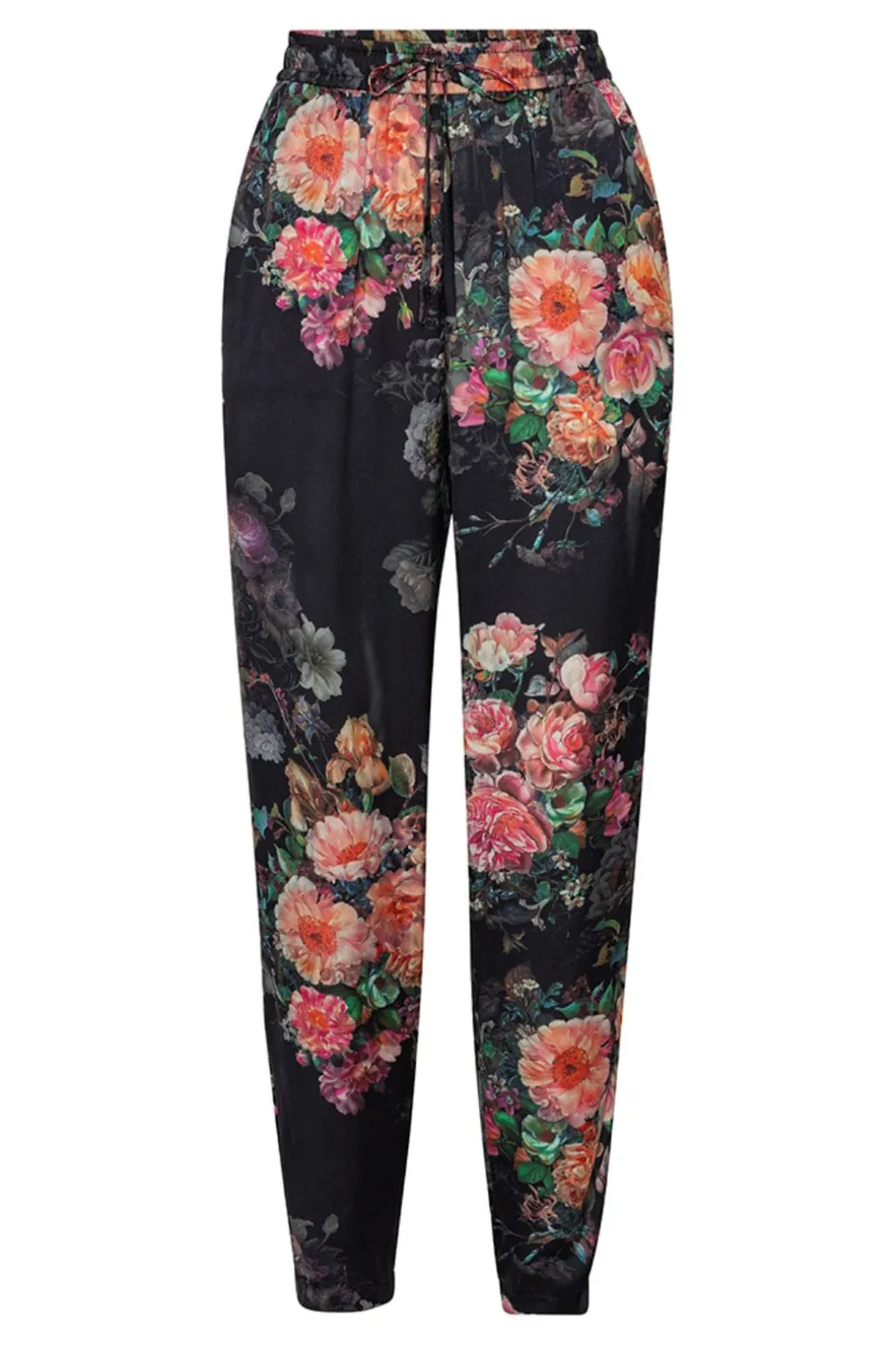 Bukser fra Karmamia med blomsterprint i rosa og grønne nuancer på sort baggrund. Den løse pasform og de to sidelommer gør bukserne praktiske til både hjemmebrug og afslappet påklædning.