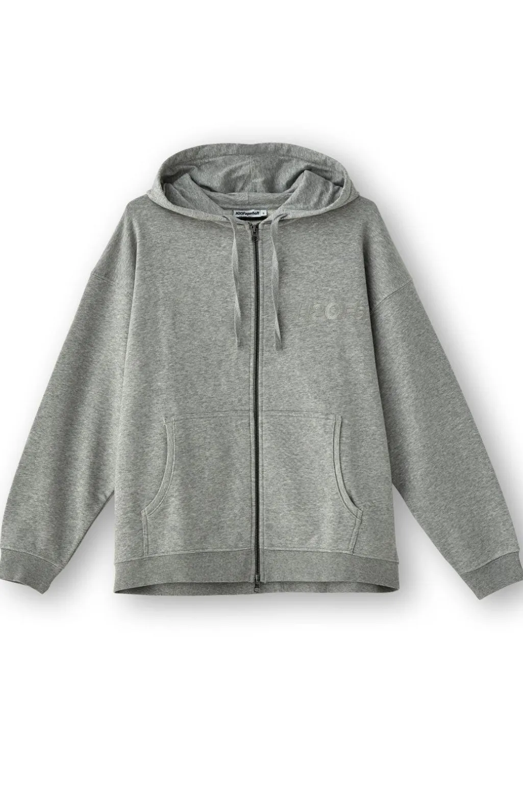 Grå hættetrøje fra H2O Fagerholt i meleret stof. Den oversized sweatshirt har lynlås, to lommer foran og et broderet logo på brystet.
