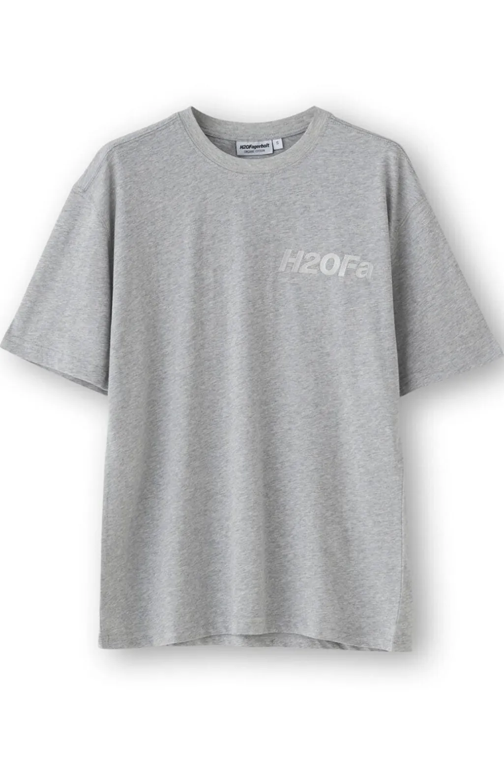 Grå meleret t-shirt fra H2O Fagerholt med oversized pasform. T-shirten har et broderet H2OFa-logo på brystet og en rund halsudskæring.