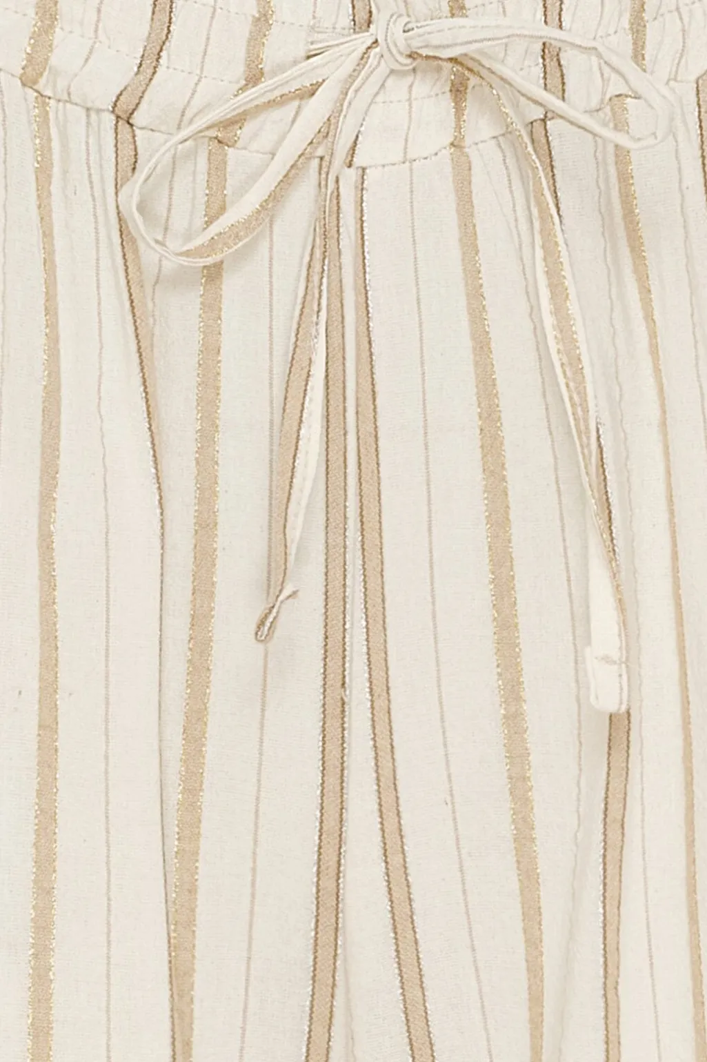 Stribede bukser fra Marta Du Chateau i lys beige med brune striber. Bukserne har en løs pasform med ankellængde og en kombination af snøre og elastik i taljen.