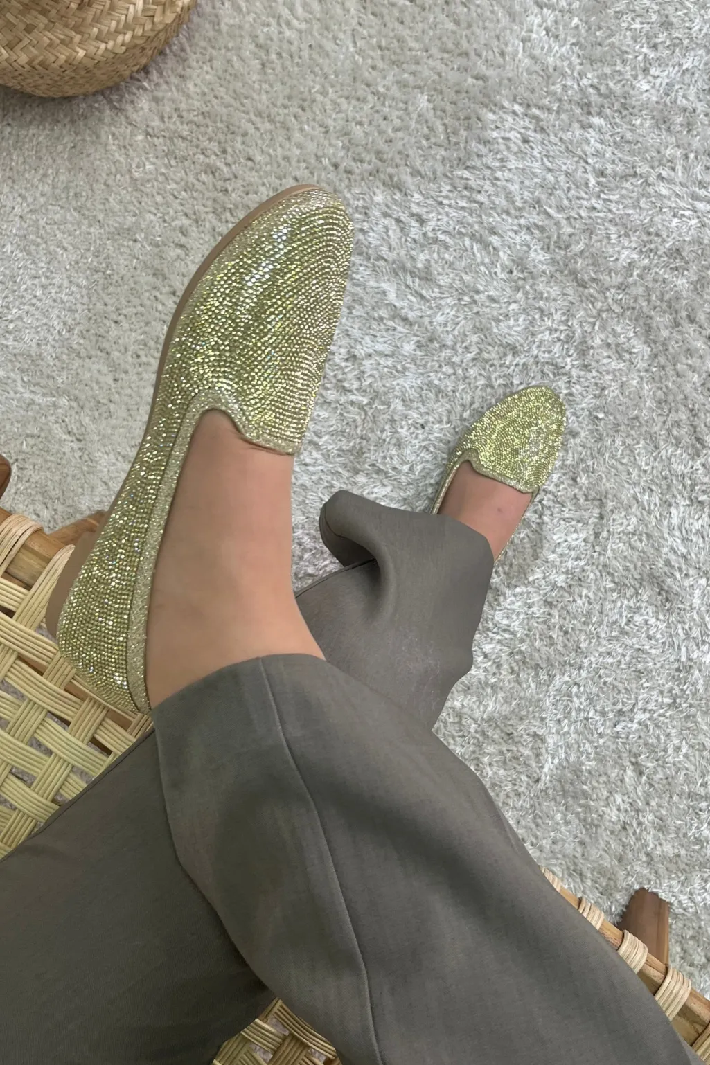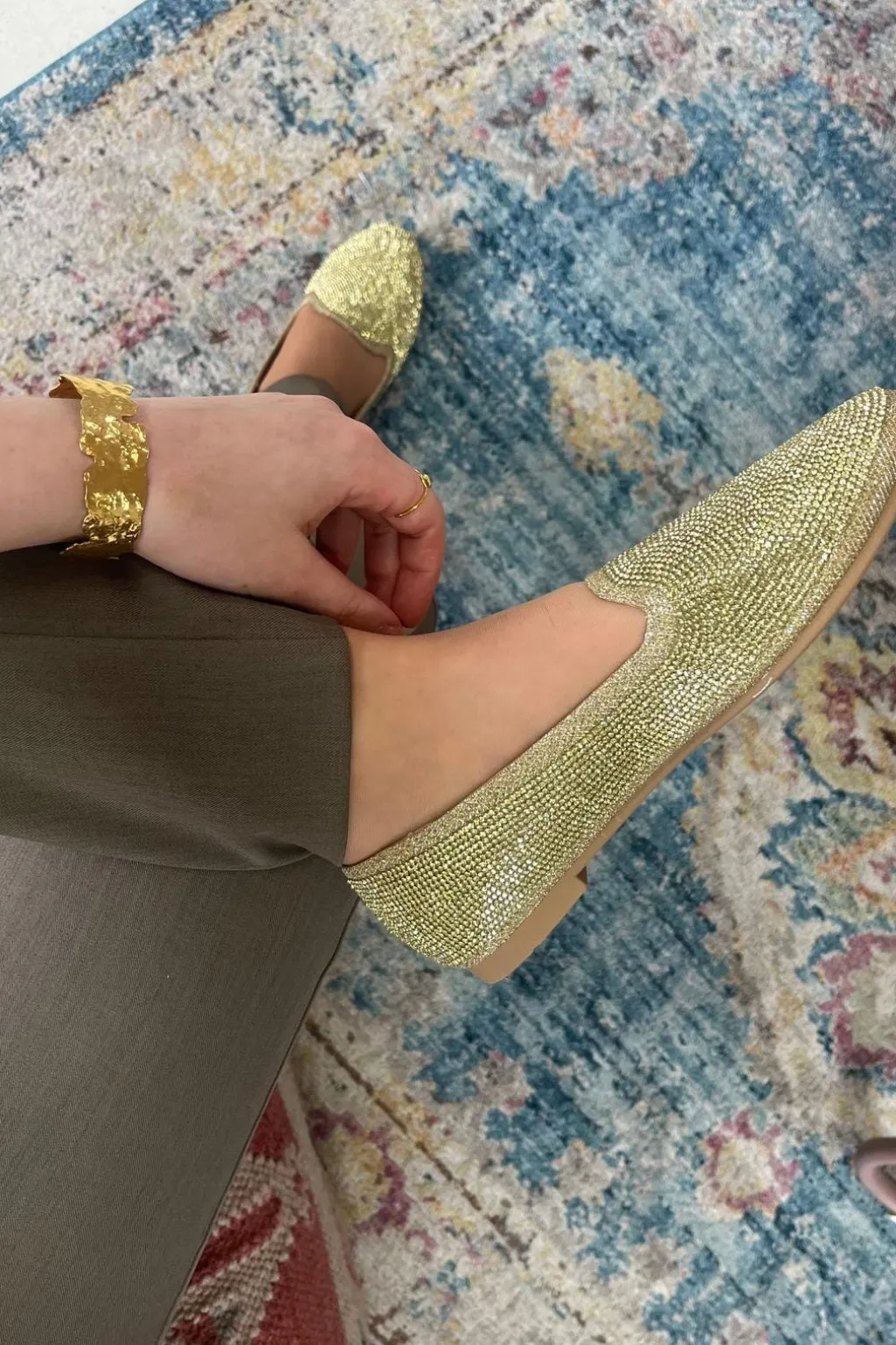 Ballerina fra Bloom med glitrende pailletter på overfladen. Den gyldne farve og det skinnende materiale gør skoen velegnet til festlige anledninger.