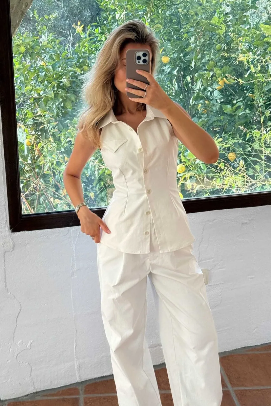 Hvid top fra BYIC med skjortekrave og knapper ned langs fronten. Toppen har fine dekorative syninger og en ærmeløs silhuet, der gør den praktisk til sommerens varme dage.