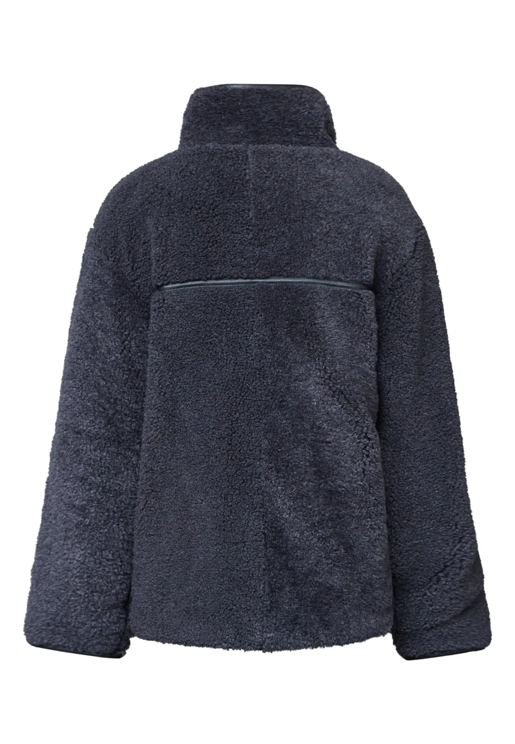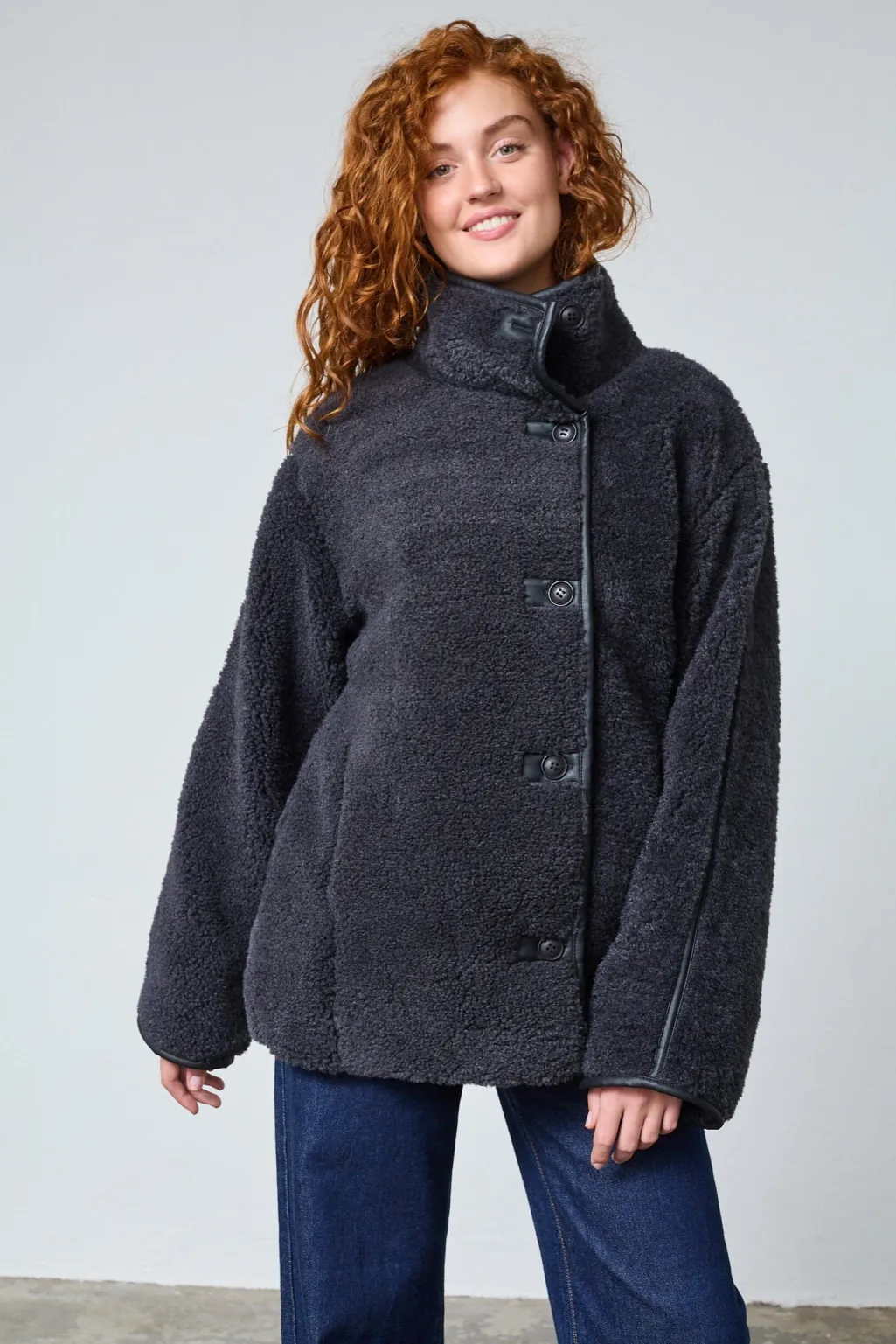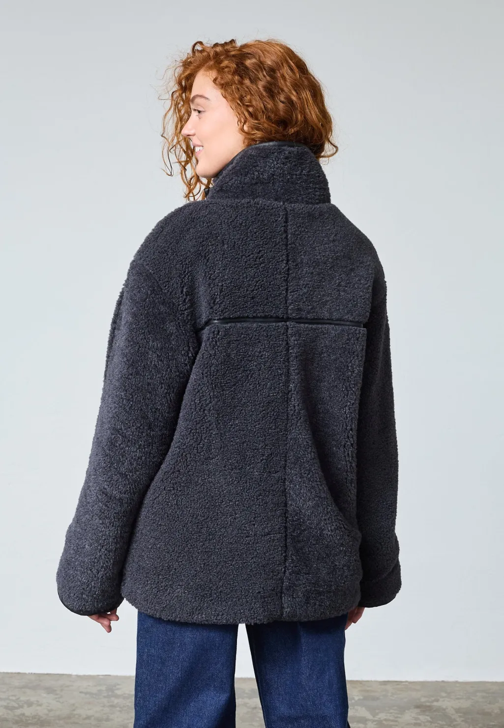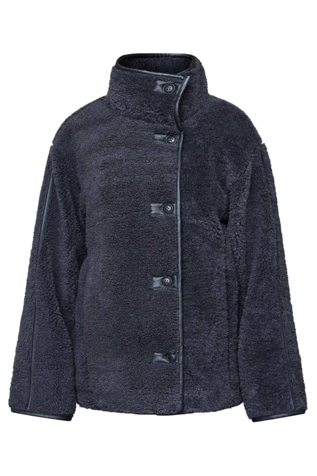 Jakke fra Sisters Point, lavet af blød imiteret plys i en mørk antracitnuance. Jakken har en høj hals og en oversized pasform.