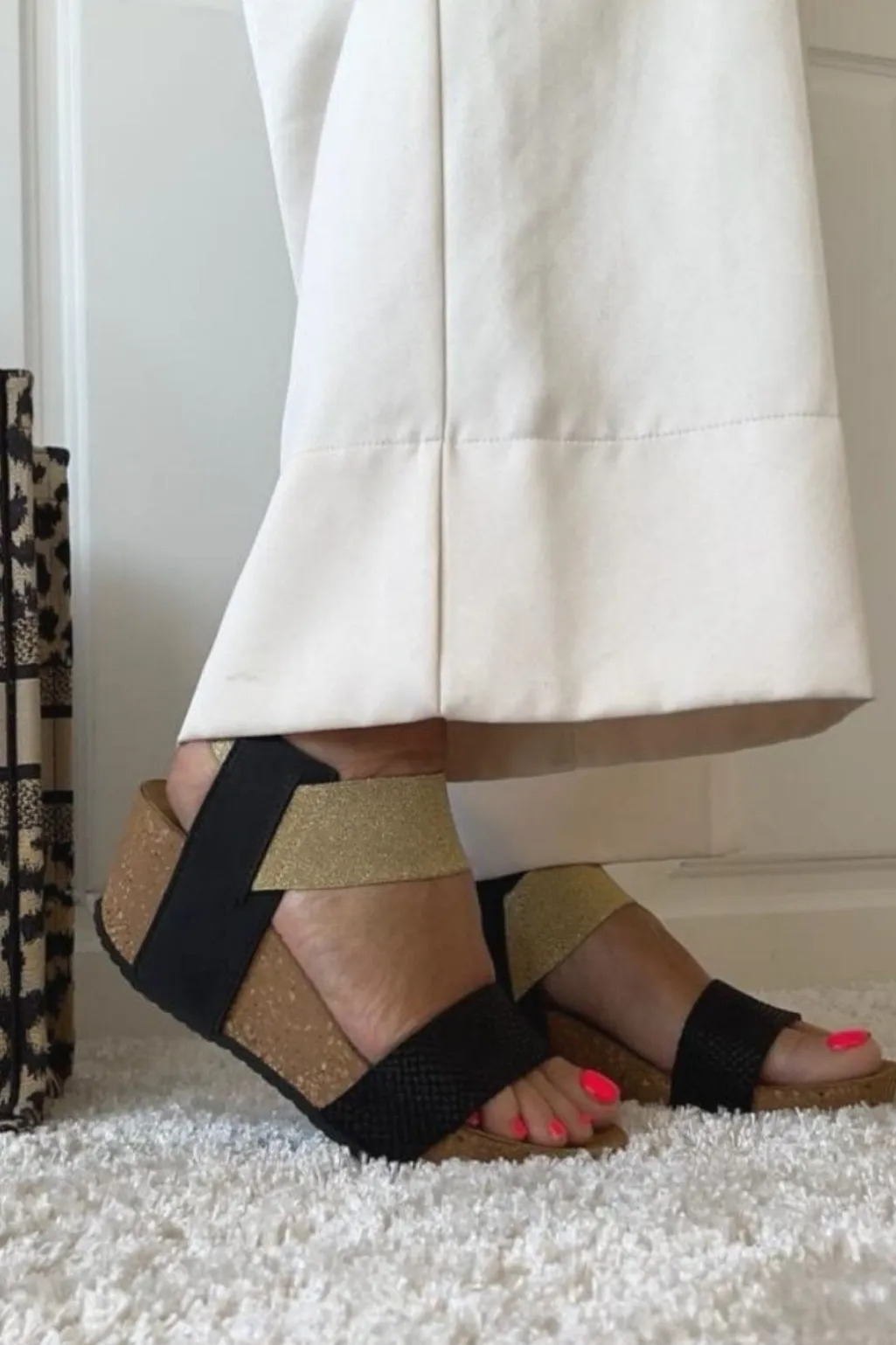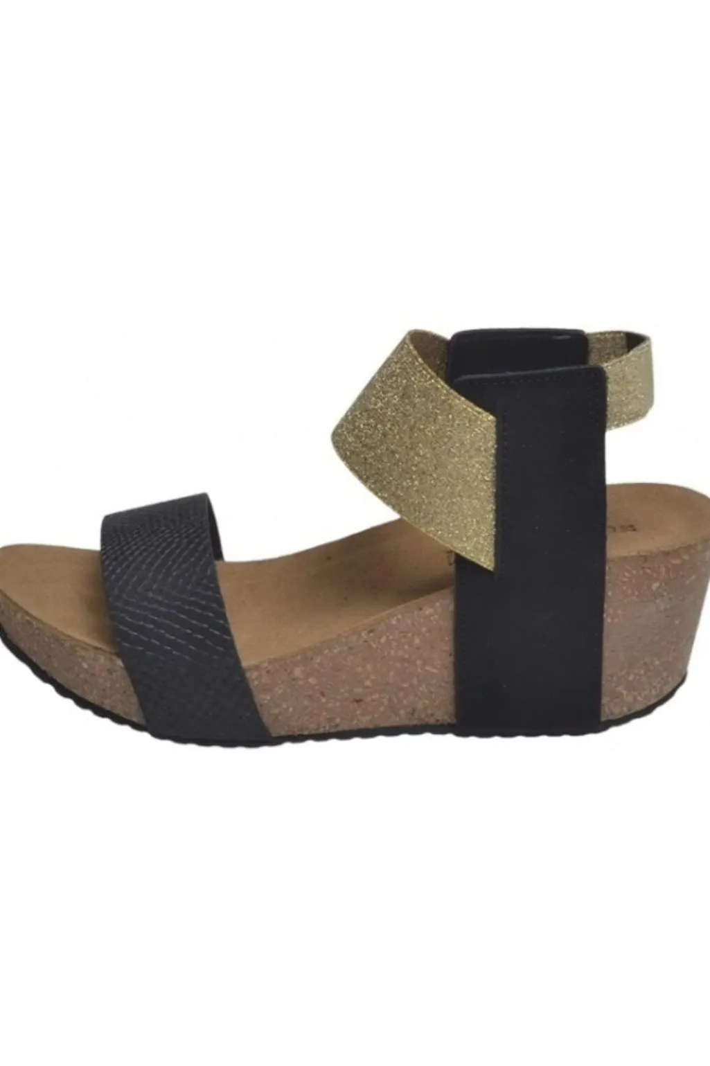 Sort sandal med slangemønstret læder og gyldne elastikstropper. Sandalen har åben tå og en kilehæl på 5-8 cm. Designet kombinerer det sorte læder med guldfarvet elastik ved anklen.