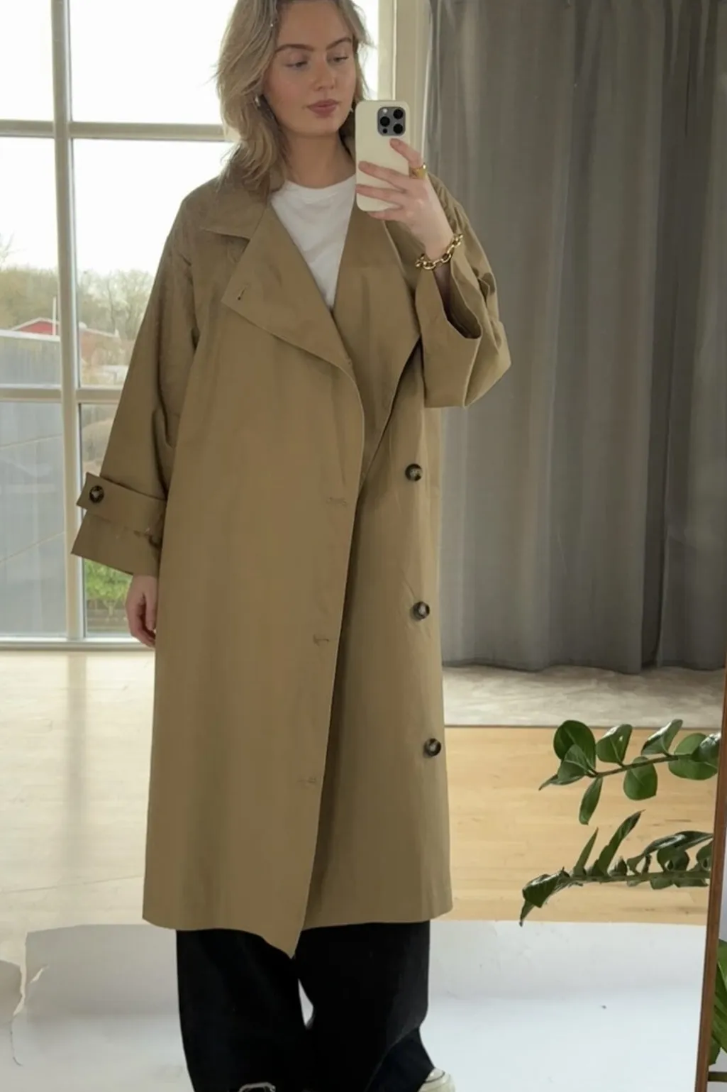 Camelfarvet trenchcoat fra Sisters Point med oversized pasform. Den har høj hals med aftagelig knaplukning og dobbelt knaplukning foran. To praktiske lommer og brede ærmer med knappede manchetter.