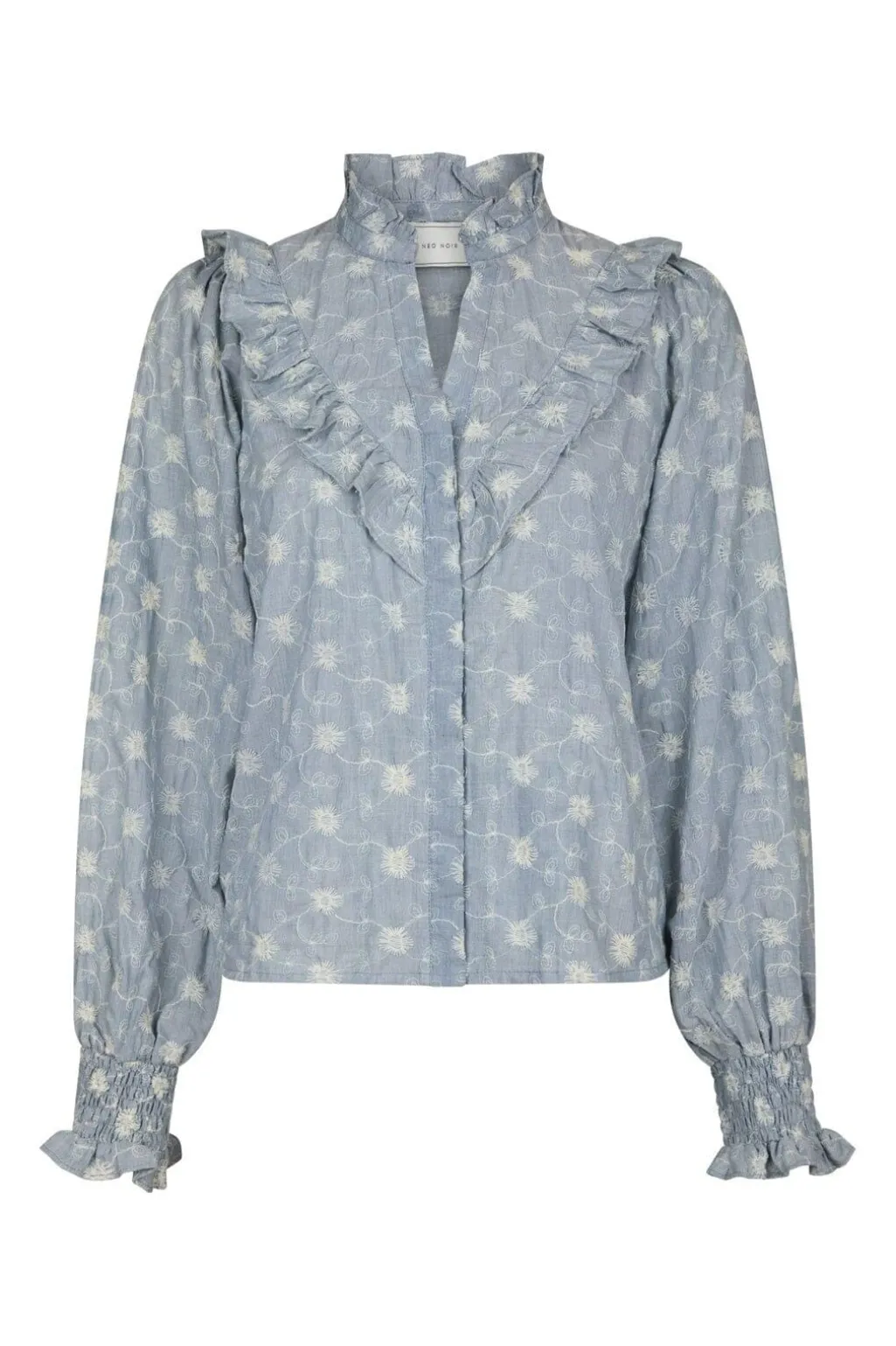 Støvet blå bluse fra Neo Noir, lavet af bomuld. Blusen har et blomstret mønster med broderi og flæsedetaljer langs halsudskæringen.