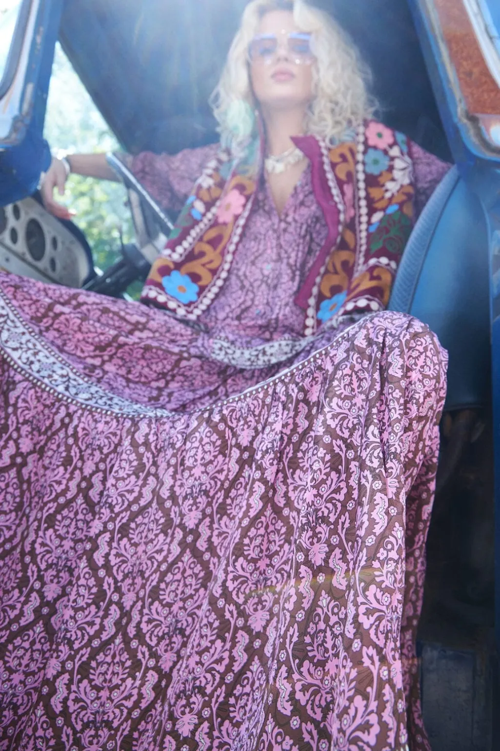 Lang nederdel fra Lollys Laundry i pink med brunt blomstermønster. Nederdelen har en høj talje med elastik og bindebånd samt flæsedetaljer langs kanten.