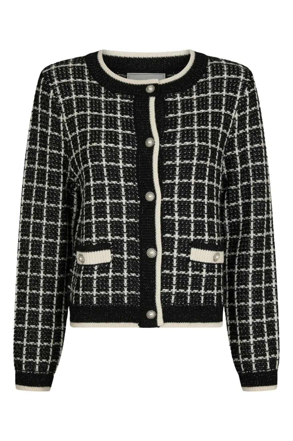 Sort strikket cardigan fra Neo Noir med hvidt ternet mønster. Cardiganen har rund halsudskæring, perleknapper og lommer foran.
