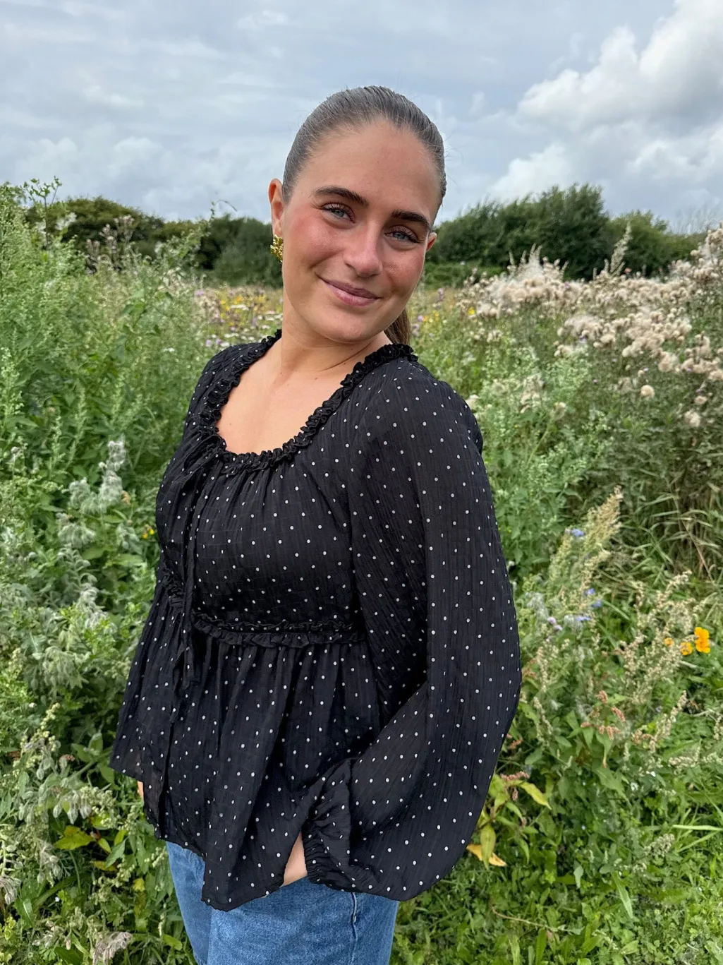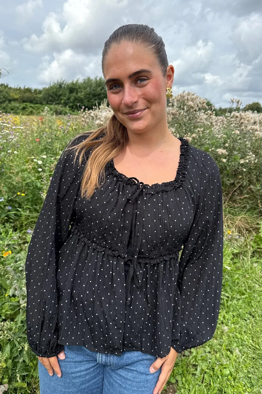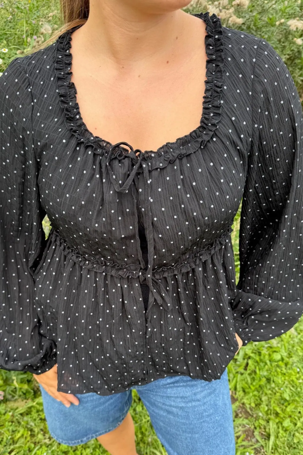 Sort bluse fra Dear Molly med hvide prikker. Blusen har en firkantet halsudskæring, lange ærmer og bindebånd i taljen.
