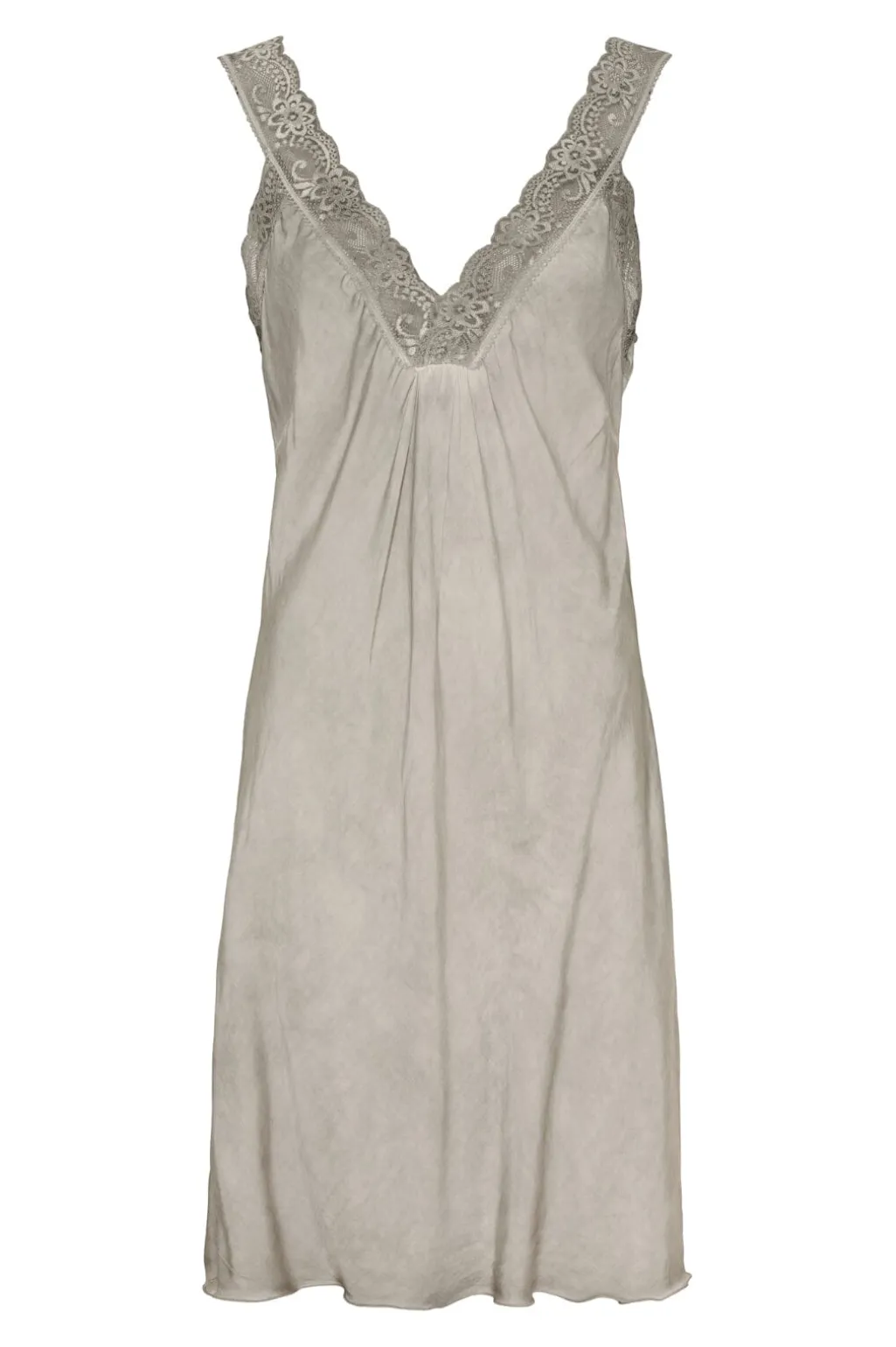 Kjole fra Marta Du Chateau i fango-farve. Den har en V-halsudskæring med blondedetaljer og et plisseret design ved brystet.