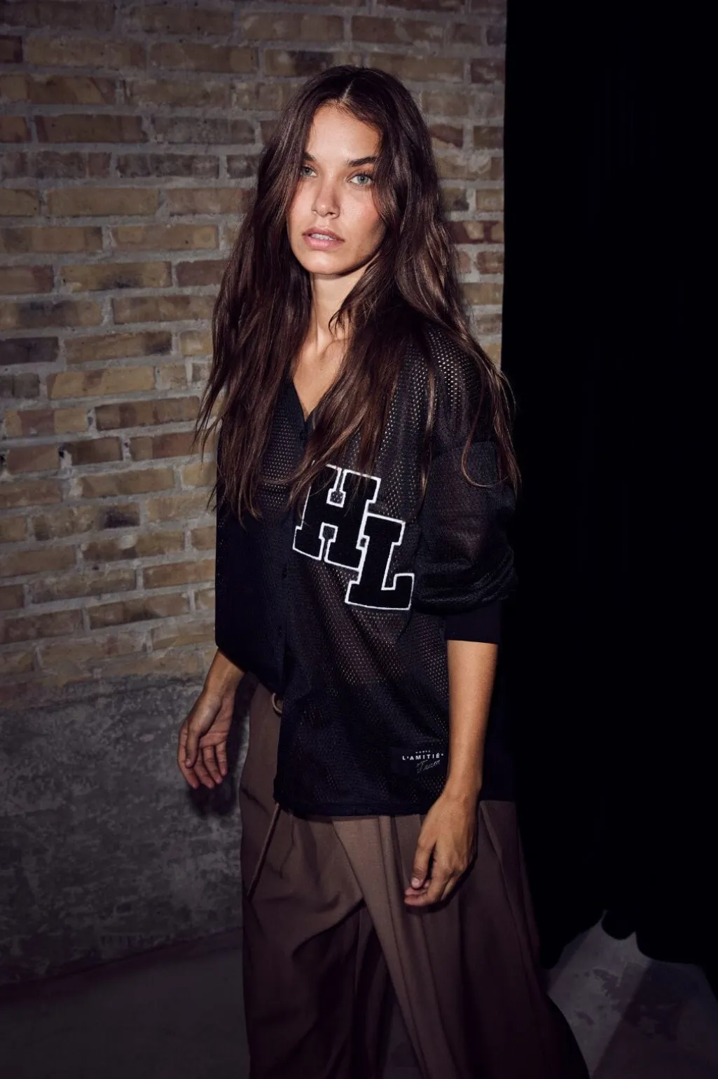 Sort bluse fra Haute L’Amitié med gennemsigtig netstruktur og stort HL-logo på brystet. Blusen har knaplukning foran og lange ærmer.