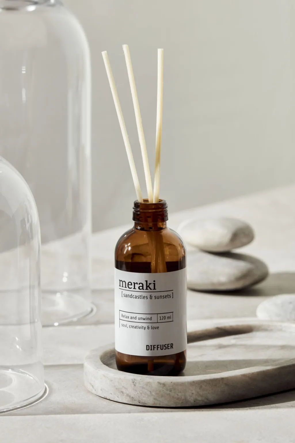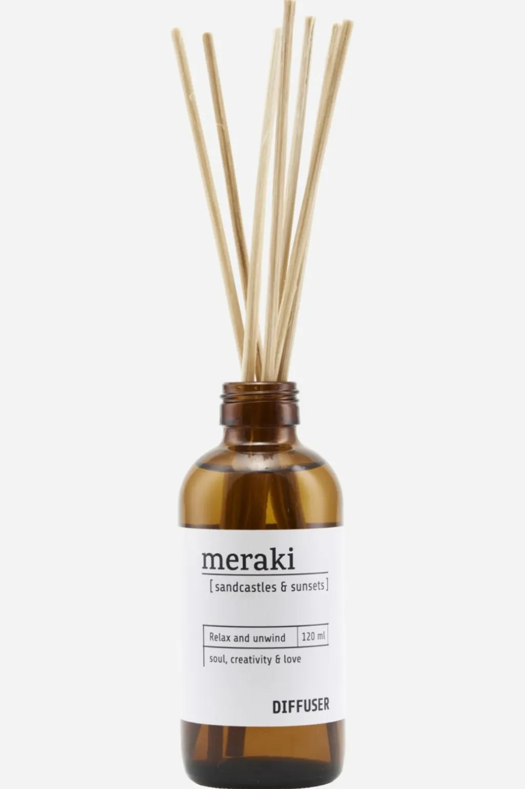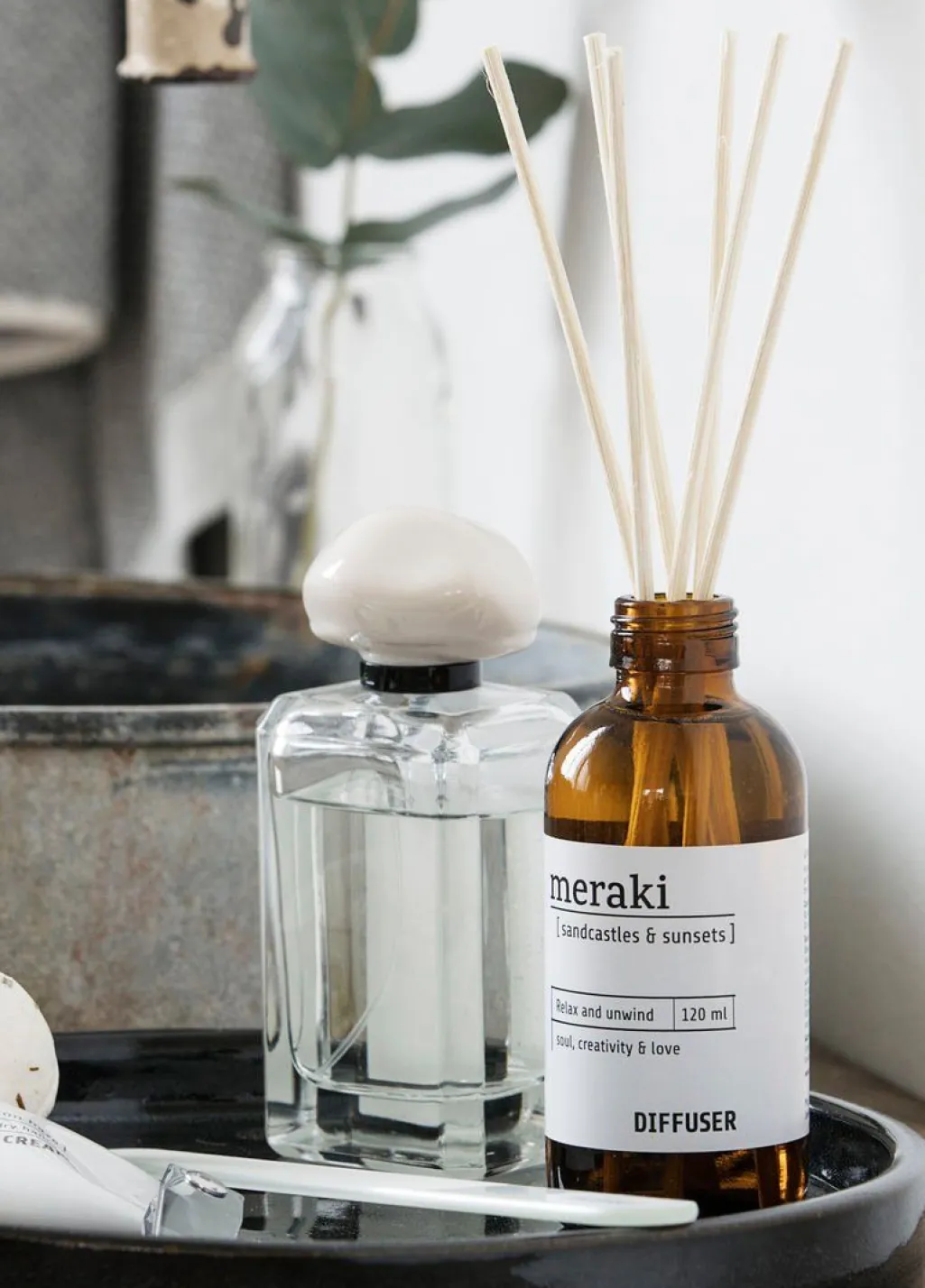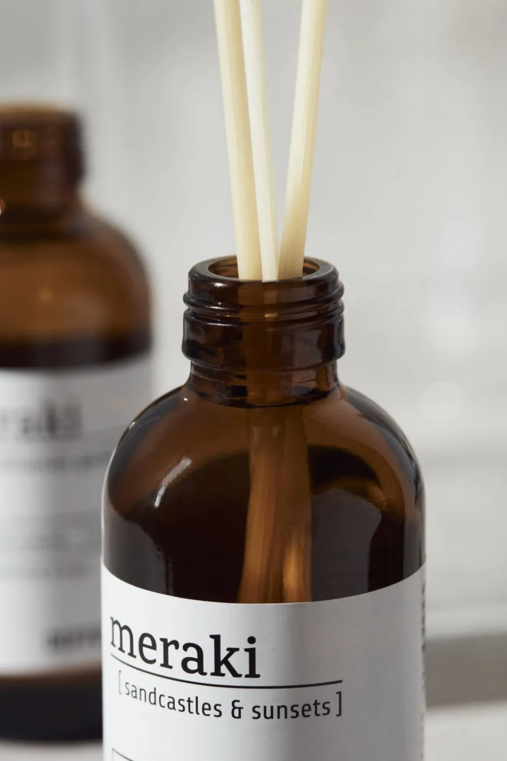 Duftfrisker med 7 pinde fra Meraki i duftvarianten Sandcastles & Solnedgange. Den brune glasflaske med hvid etikette indeholder 120 ml duftende væske.