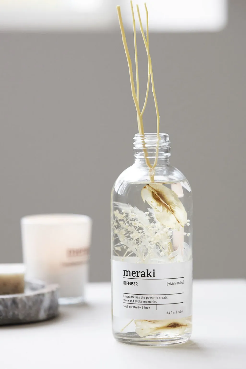 En duftfrisker fra Meraki med tørrede blomster og træpinde i en klar glasflaske. Flasken indeholder 240 ml duftende væske med friske og blomstrede noter.