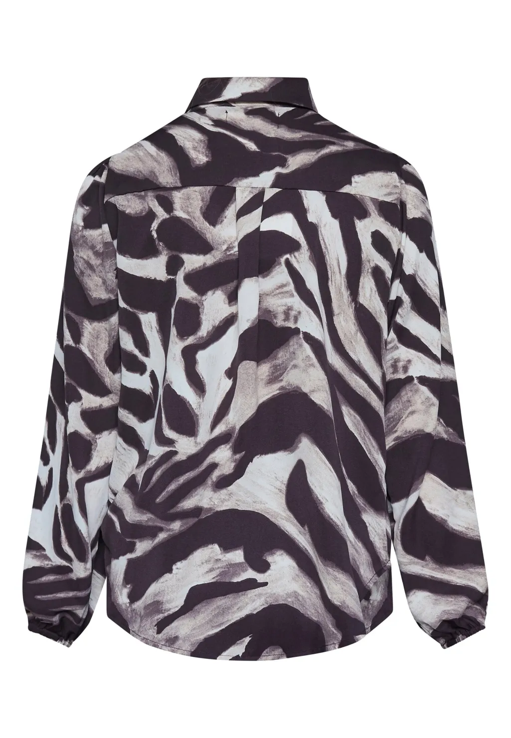 Bluse fra Sisters Point med grafisk stribemønster i brune og beige nuancer. Blusen passer til både afslappede dage og festlige lejligheder.