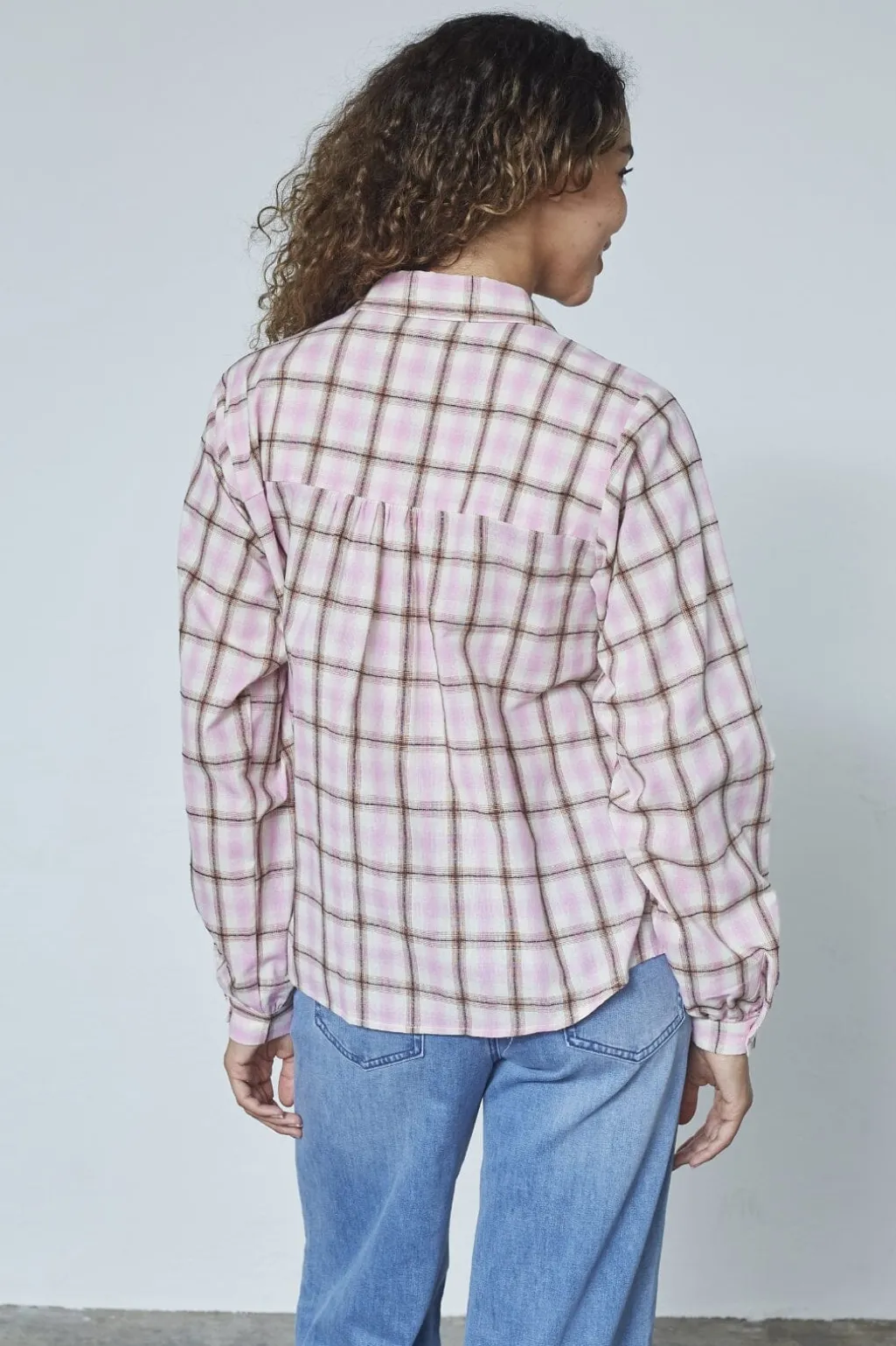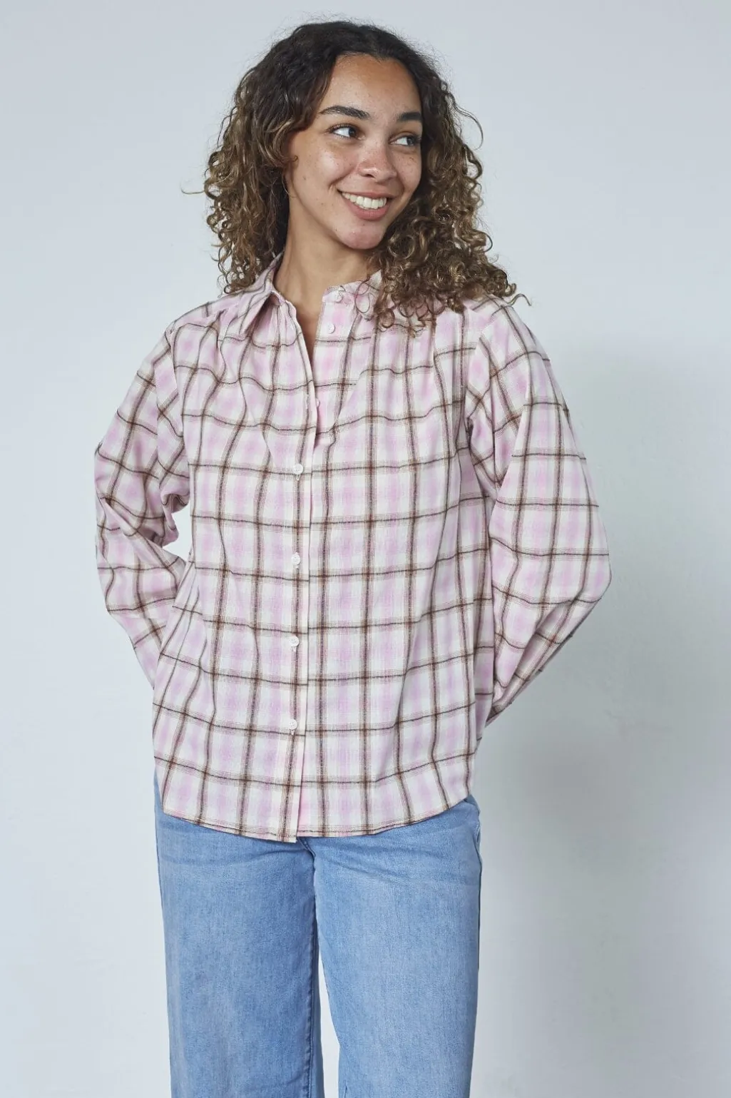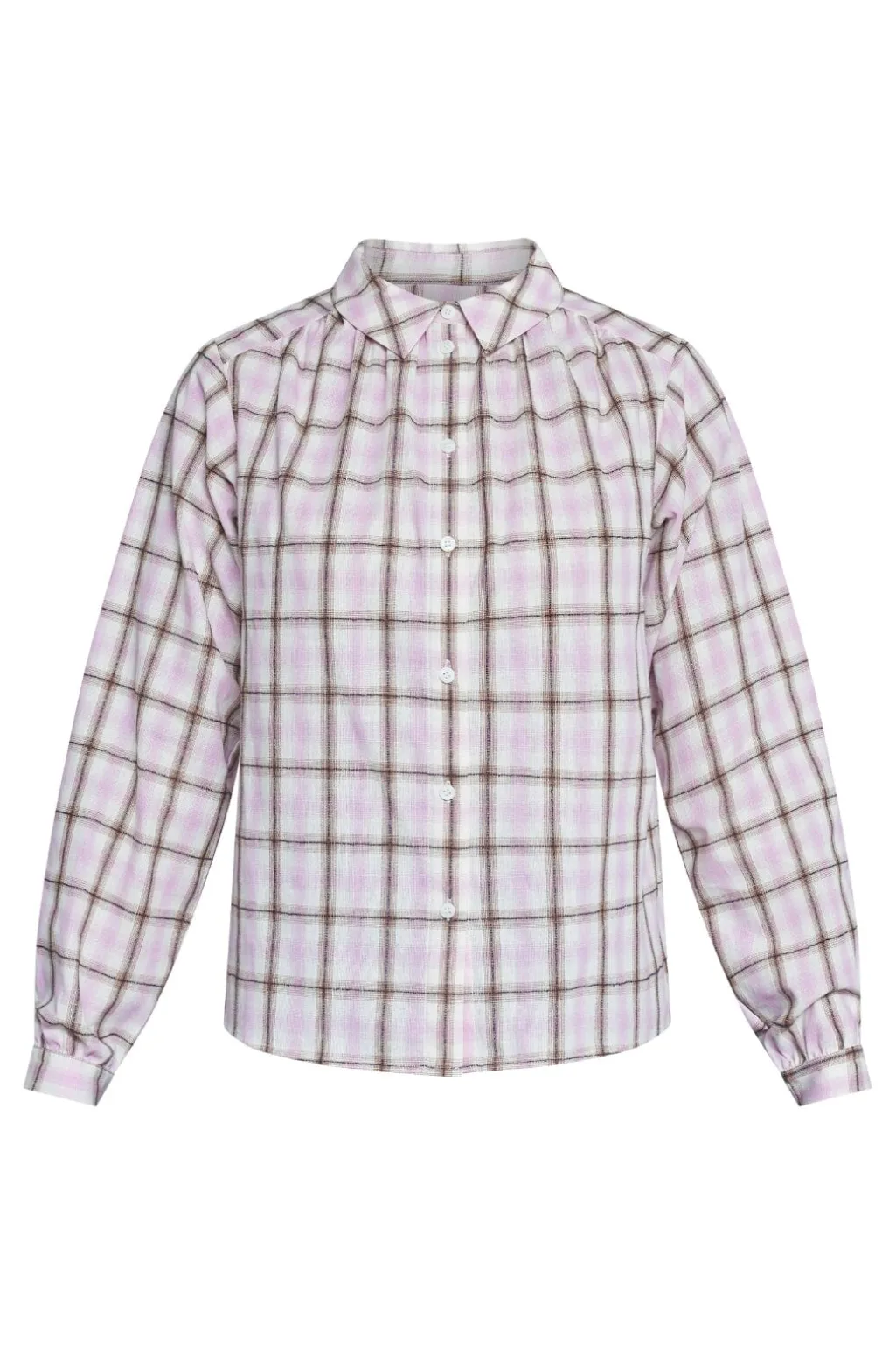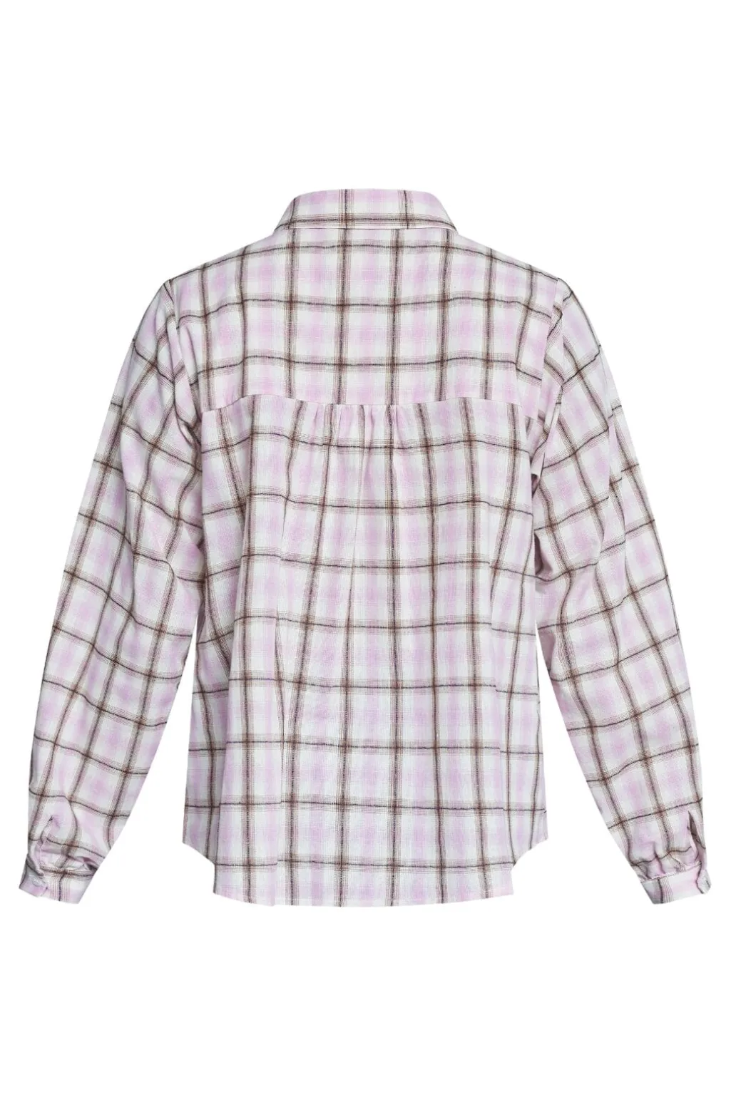 Skjorte fra Sisters Point i lyserød tern. Den har en klassisk krave og lange ærmer med rynkedetaljer ved skuldrene. Skjorten lukkes med knapper hele vejen ned foran.