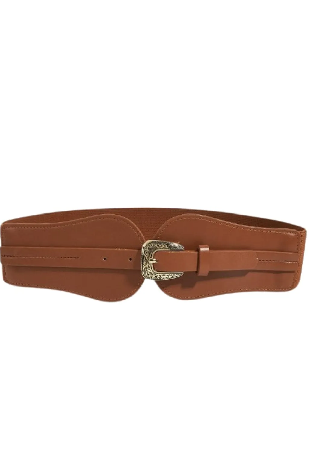 Brunt bælte fra Anobel Copenhagen i elastisk raffiamateriale. Den runde spænde med udskæringer i messing giver bæltet et rustikt præg.