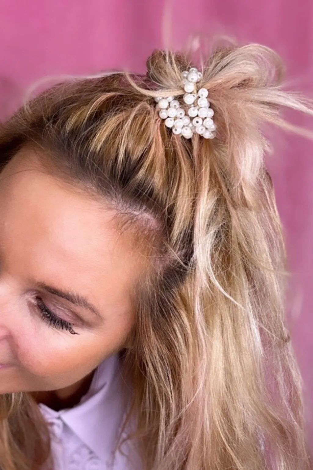 Denne hårelastik prydes af fine perler, der tilføjer et strejf af glamour til din hverdagsfrisure eller en sofistikeret opsætning til aftenbrug.