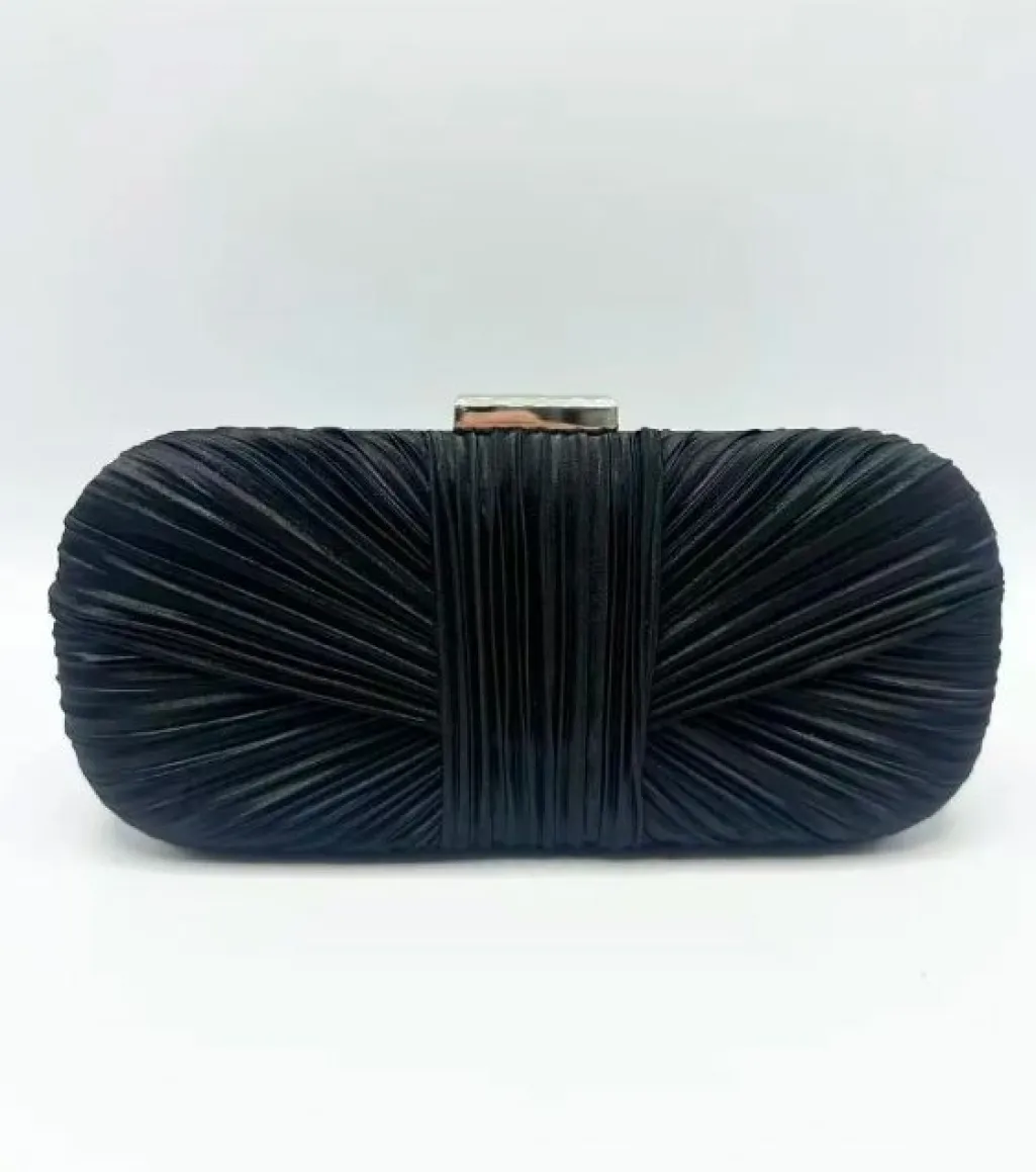 Sort clutch fra Anobel Copenhagen med et plisseret design. Tasken har en rektangulær form med afrundede hjørner og en metallisk lukning.