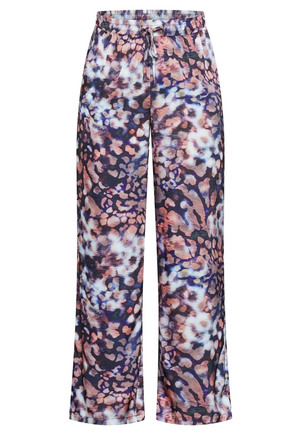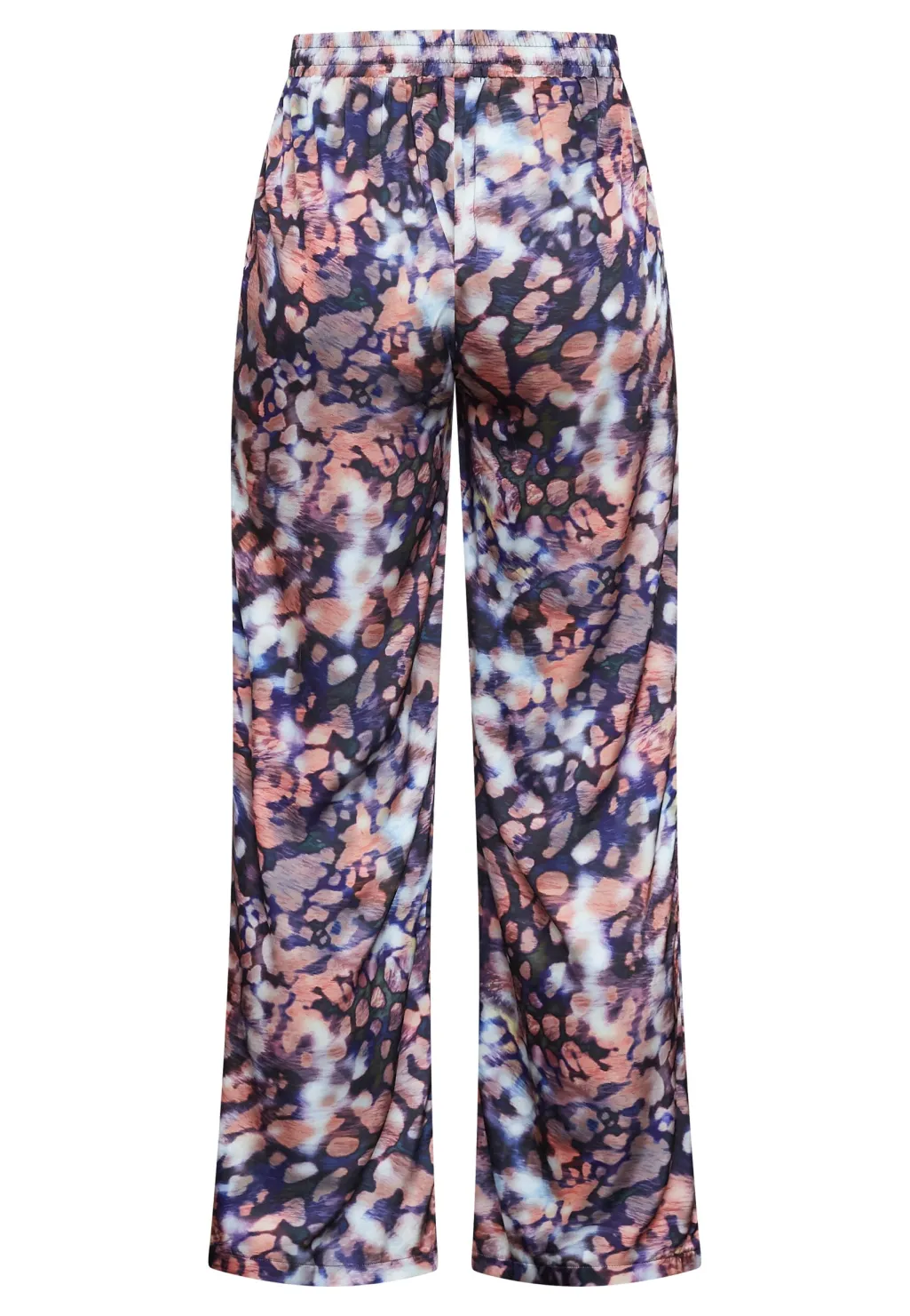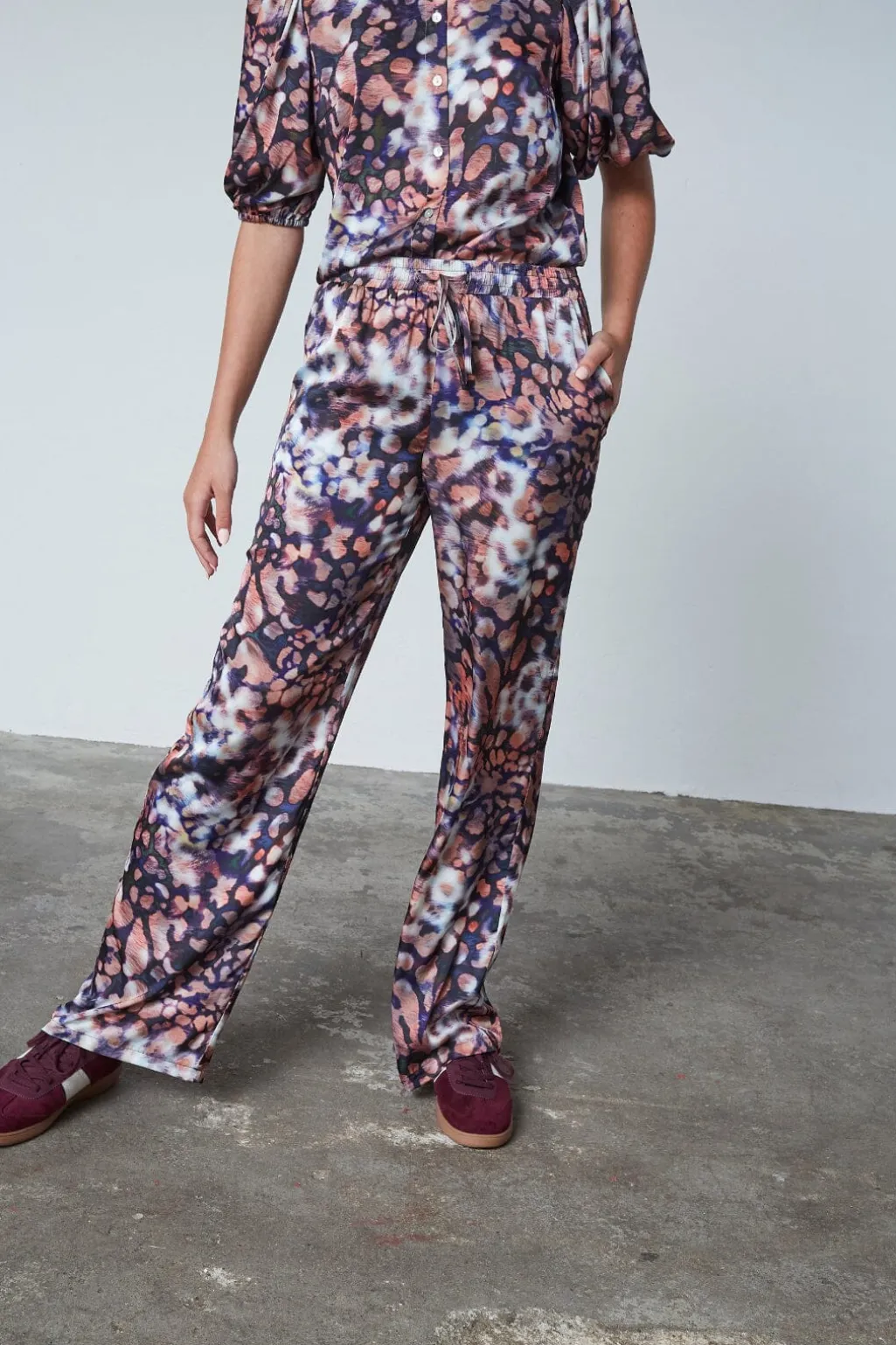 Multifarvede bukser fra Sisters Point med et abstrakt mønster i pink, blå og hvid. Bukserne har løse, brede ben og en høj talje.