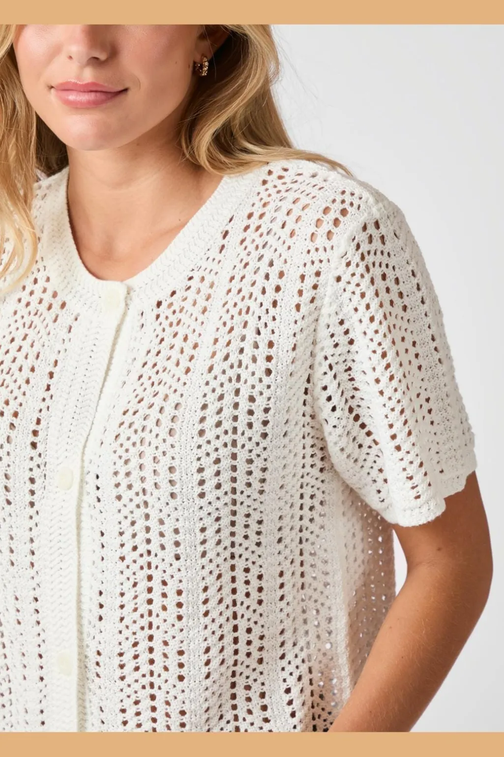 Hvid hæklet cardigan fra Neo Noir med kortærmet design. Cardiganen har et gennemgående hæklet mønster og knaplukning foran.