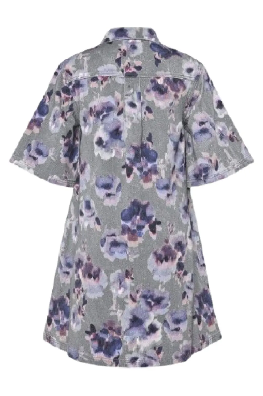 Kjole fra Moves by Minimum i grå med blomstermønster i lilla nuancer. Den har polokrave og korte ærmer med lynlås i halsen.