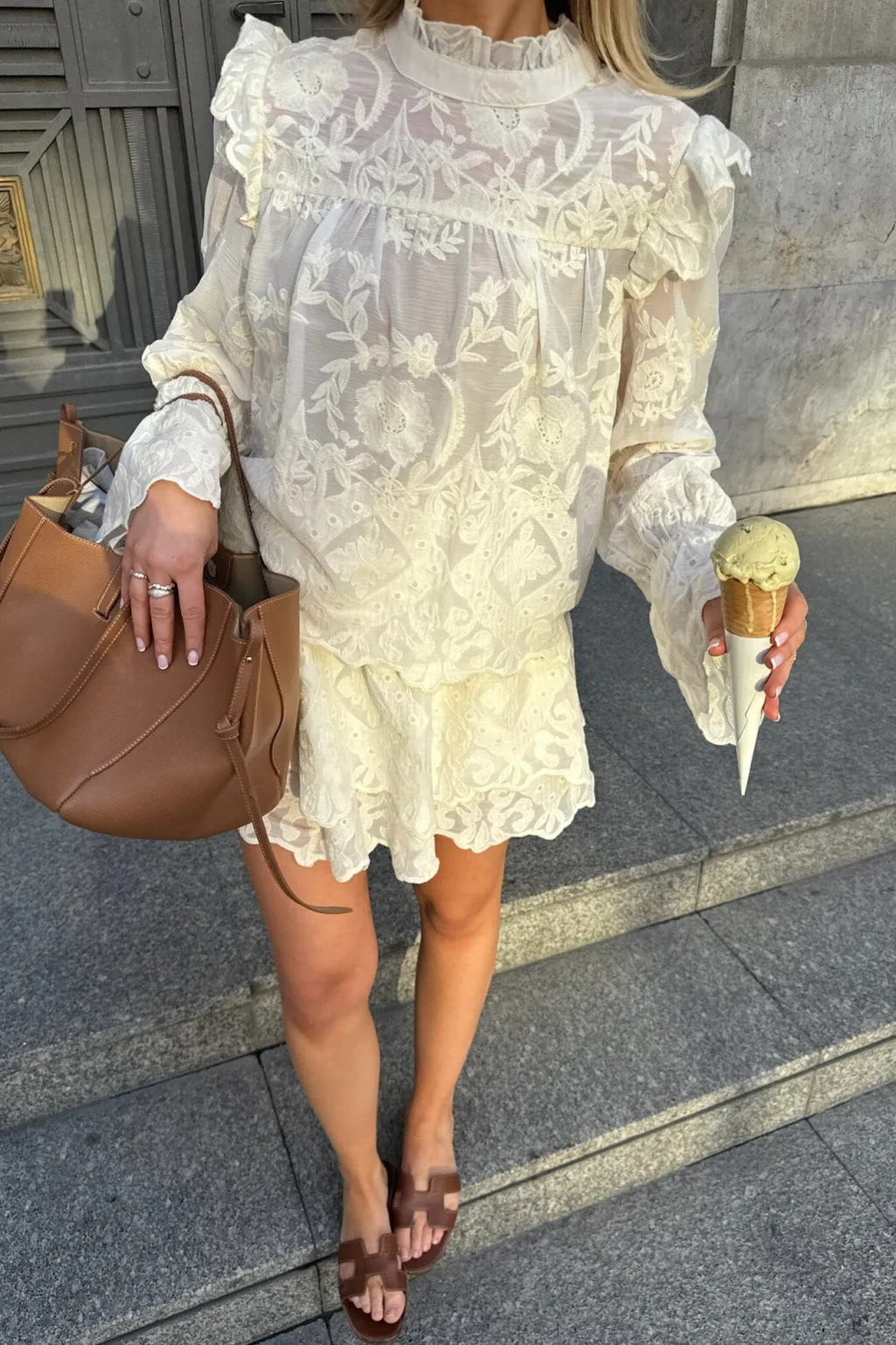 Hvid blondebluse fra BYIC med gennemsigtig blonde og broderede mønstre. Blusen har høj hals med flæser og lange ærmer med flæsekanter.