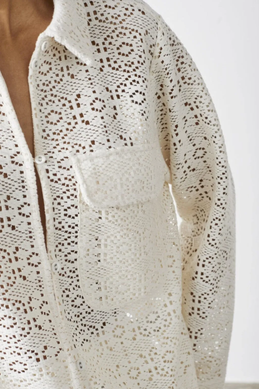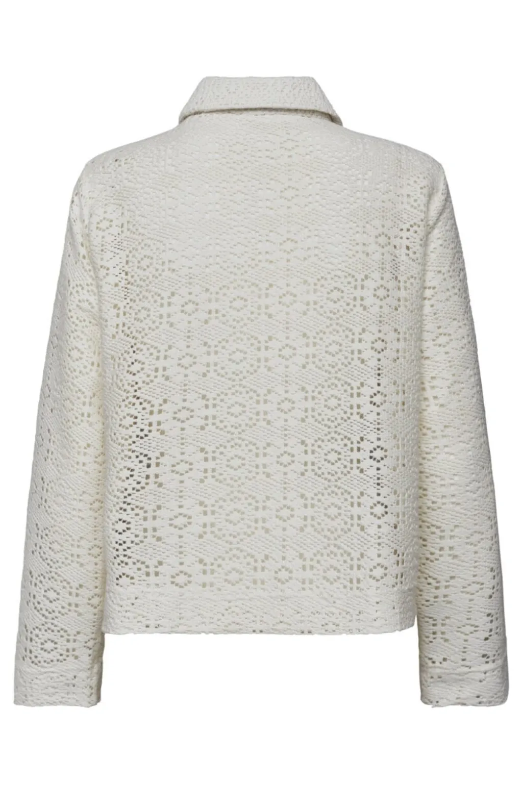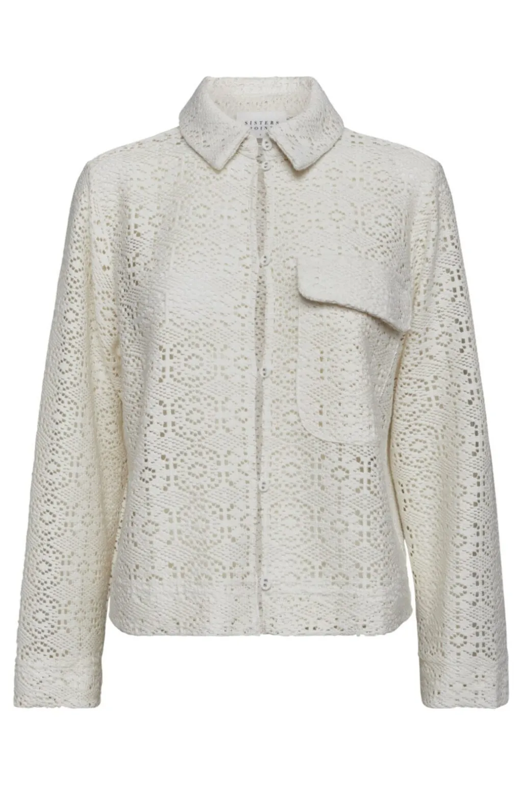 Cremefarvet skjorte fra Sisters Point med gennemvævet blondemønster og broderi. Skjorten har klassisk krave og knapper foran samt lange ærmer.