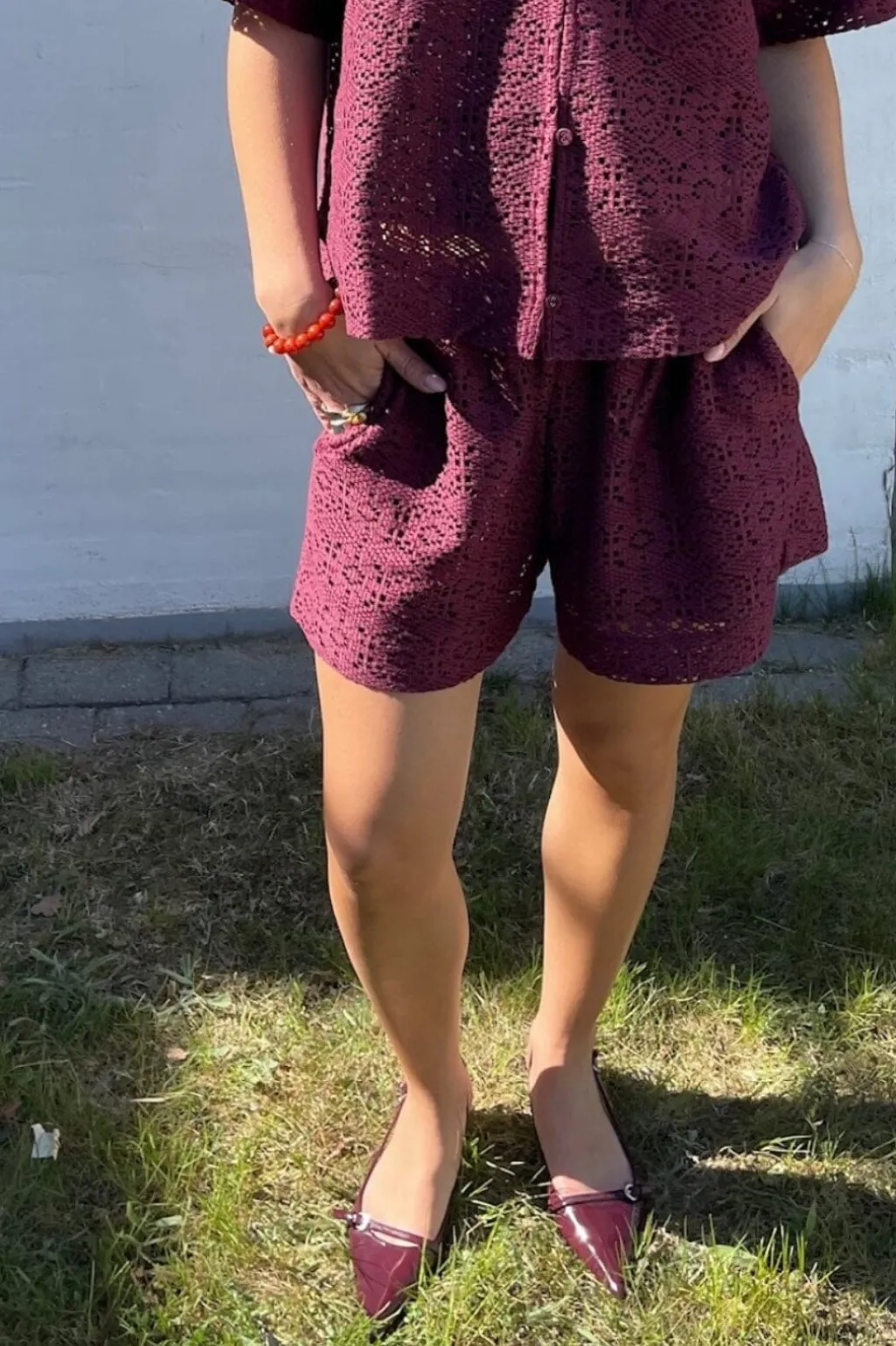 Den mørke bordeauxnuance fungerer godt sammen med både lyse og mørke farver. Shortsene kan styles med en t-shirt om dagen eller en bluse om aftenen.