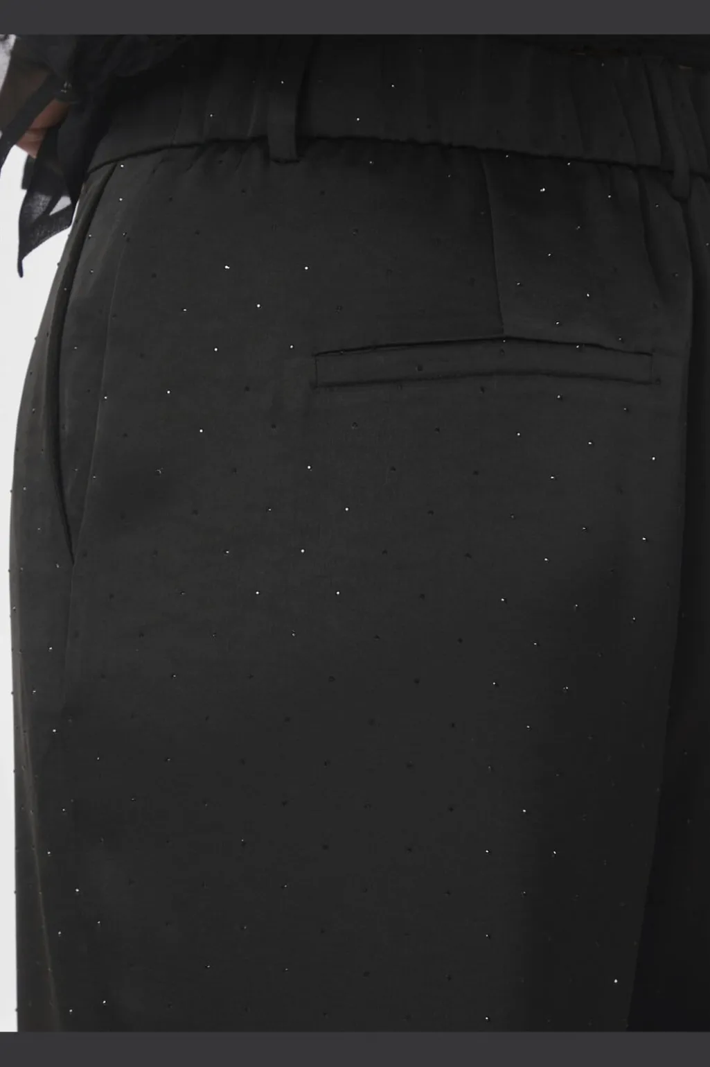Sorte bukser fra Neo Noir i kraftig satin med påsyede sten. Bukserne har høj talje og vid pasform, der går helt ned til gulvet.