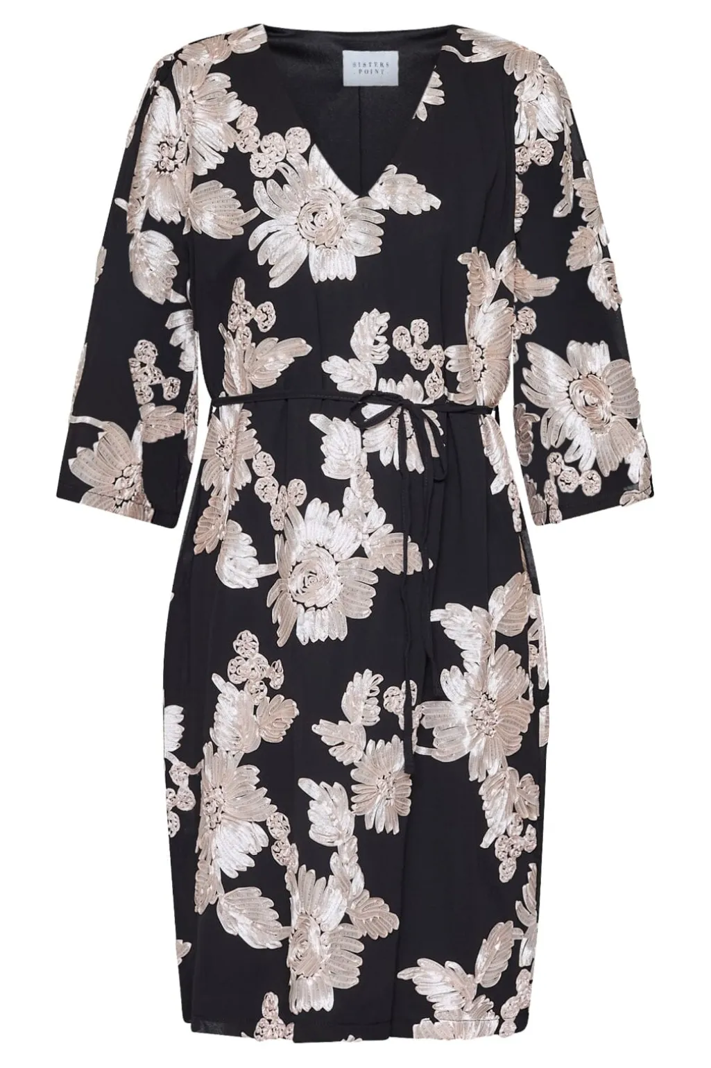 Sort kjole fra Sisters Point med et blomstermønster i champagne-nuancer. Kjolen har V-udskæring, trekvartlange ærmer og er knælang.