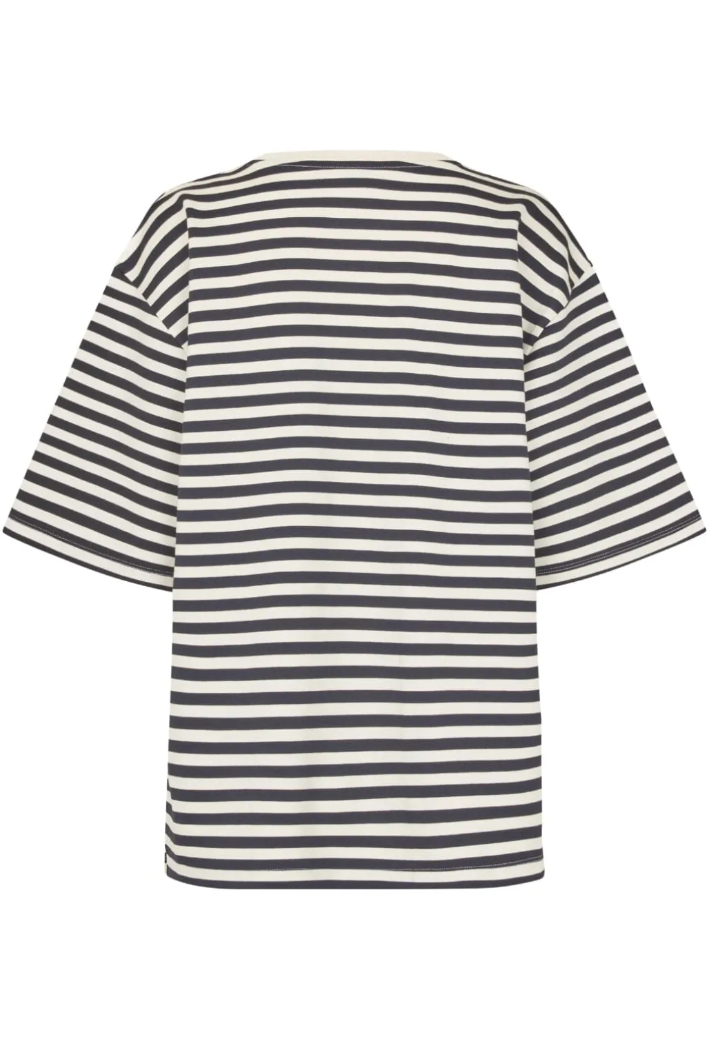Stribet t-shirt fra MbyM med vandrette striber i marineblå og cremehvid. Den har en rund halsudskæring og brede ærmer med en afslappet pasform.