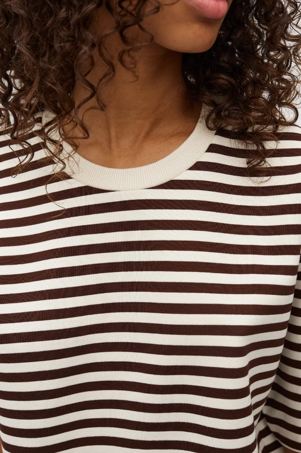 Stribet t-shirt fra MbyM i brune og cremefarvede striber. T-shirten har 3/4-ærmer og en rund halsudskæring.