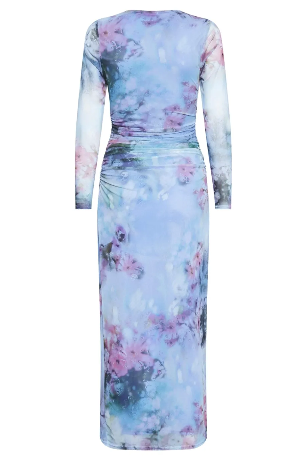 Meshkjole fra Sisters Point med tie-dye mønster i blå, pink og grønne nuancer. Kjolen har lange ærmer, rund hals og rynkedetaljer i taljen.