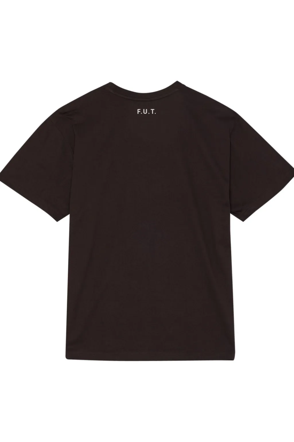 Mørkebrun t-shirt fra HALO, lavet af 100 % økologisk bomuld. T-shirten har korte ærmer og en løs pasform med F. U.T.-tekst på ryggen.