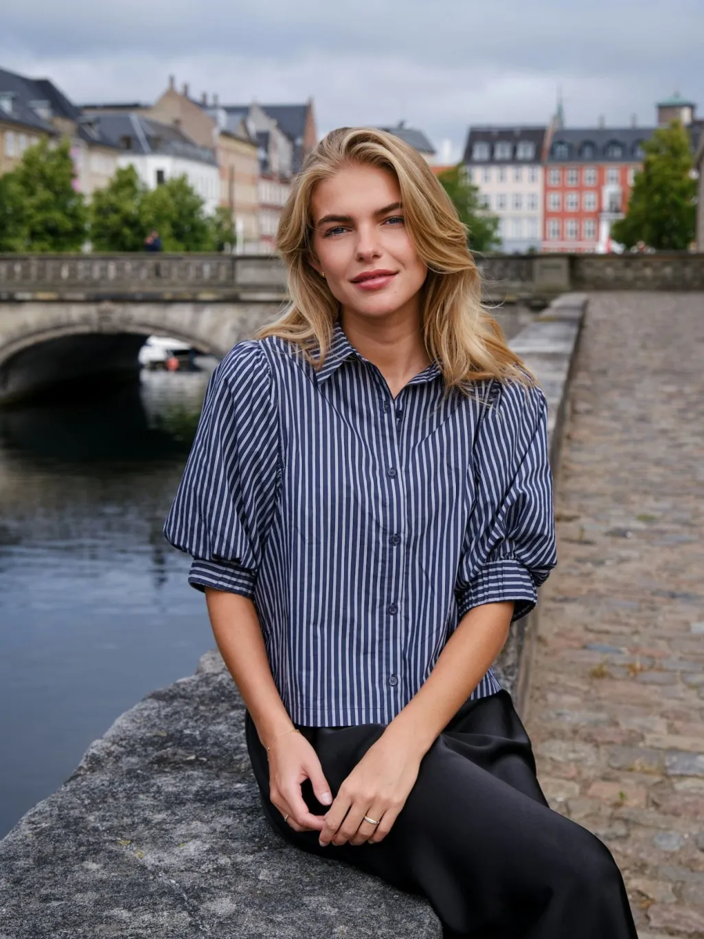 Mørkeblå stribet skjorte fra Neo Noir med korte puffærmer. Skjorten har vertikale striber i mørkeblå og hvid, klassisk skjortekrave og knaplukning foran.