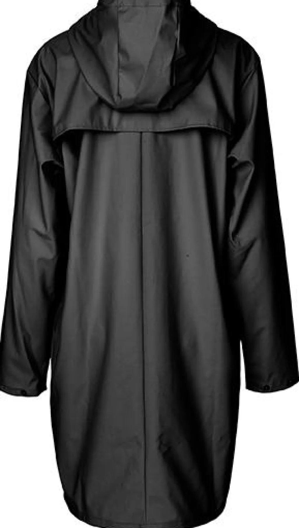 Lækker lang regnjakke i sort fra MbyM. Har hætte, frontlommer og lukkes med trykknapper.