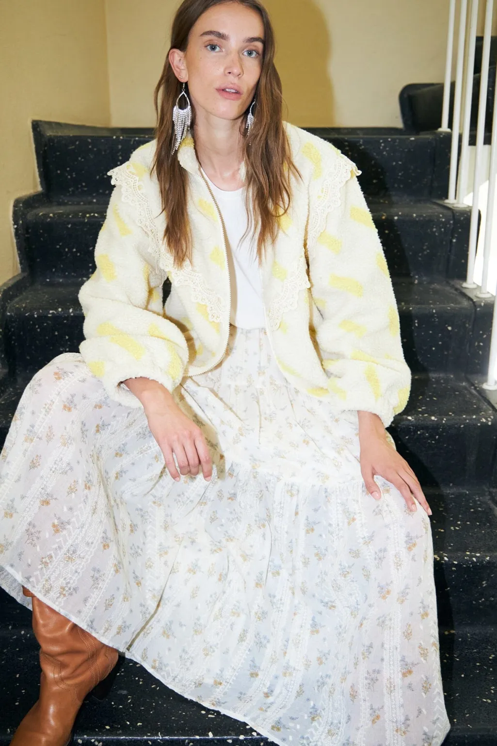 Lys gul jakke fra Lollys Laundry med høj krave og lynlås. Jakken har et gult print på cremefarvet baggrund og er udsmykket med blondedetaljer og flæser.