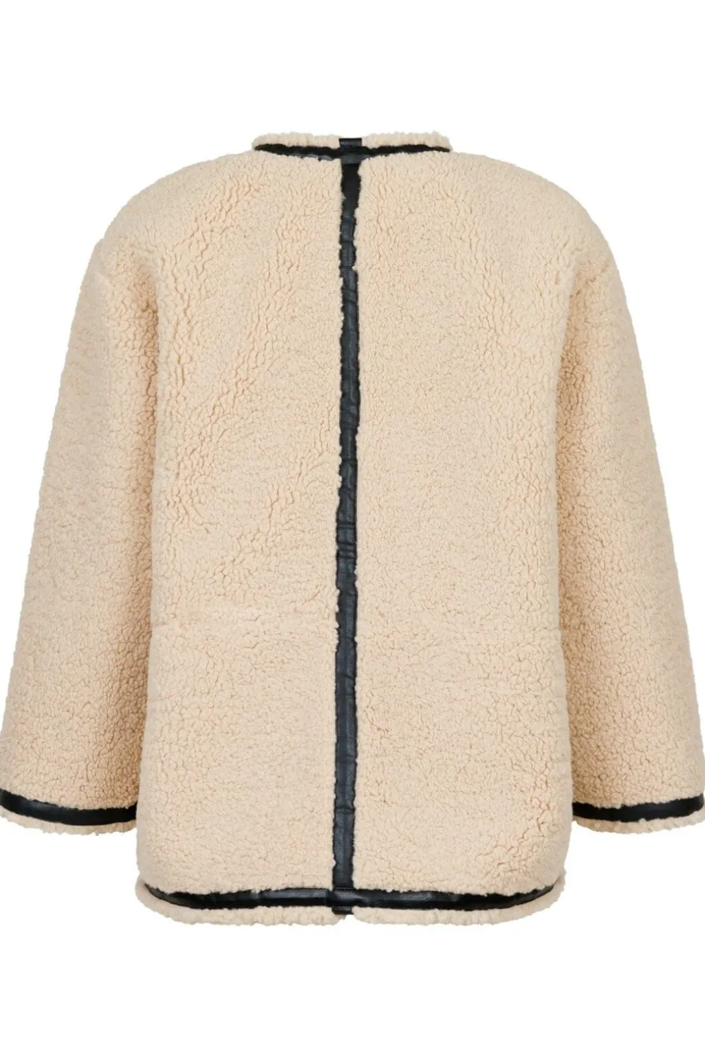 Teddyjakke i camel med blød tekstur og sorte detaljer. Den har en afslappet pasform med lange ærmer og praktiske lommer. Knapperne i front giver jakken et karakteristisk udtryk.