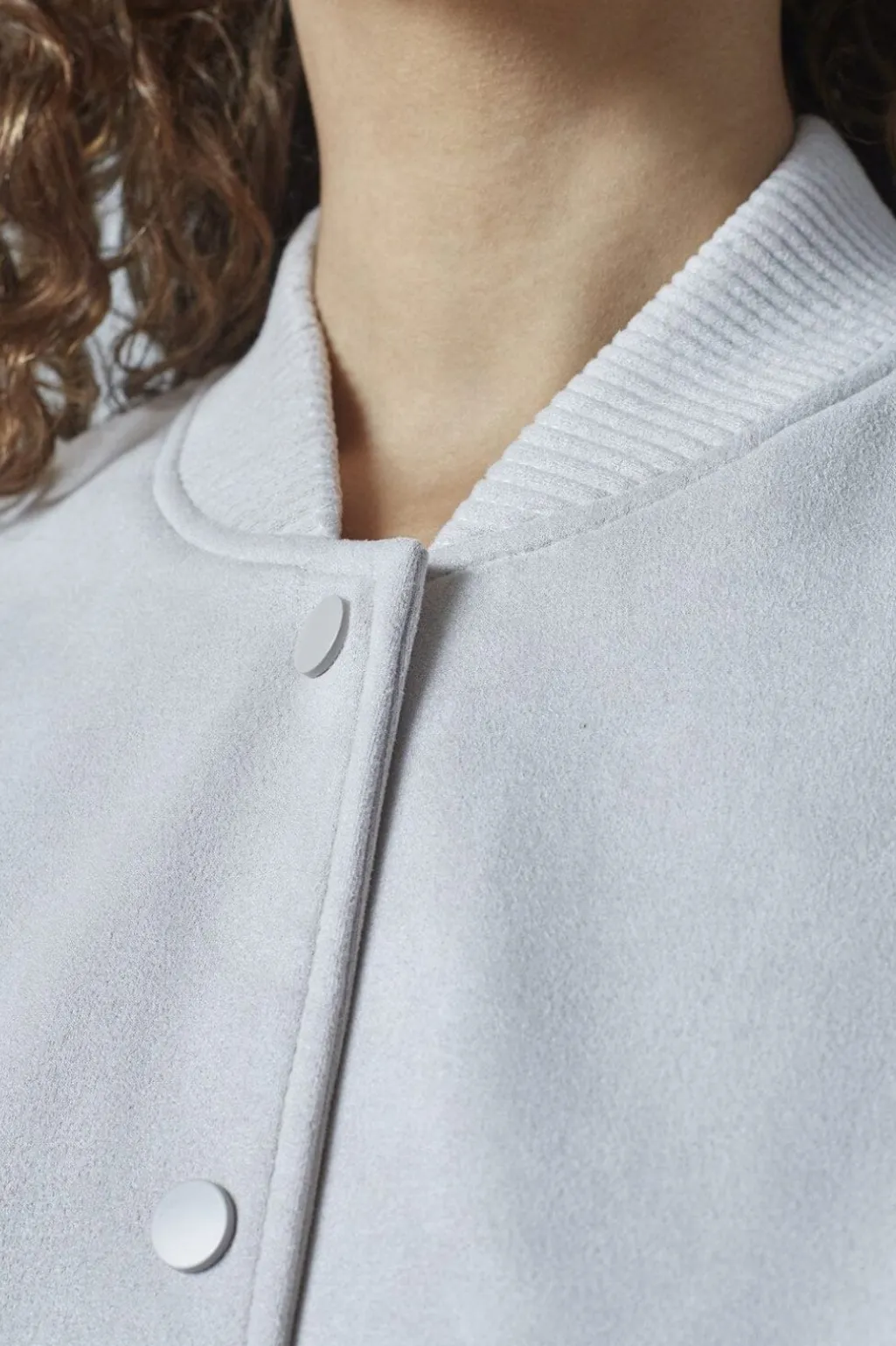Cremehvid bomberjakke fra Sisters Point med kort længde og ribkanter. Jakken har en løs pasform med trykknapper og to frontlommer.