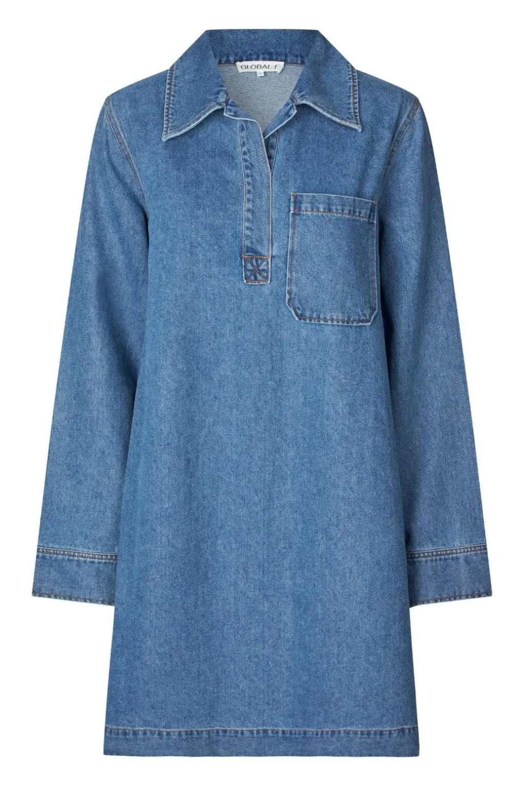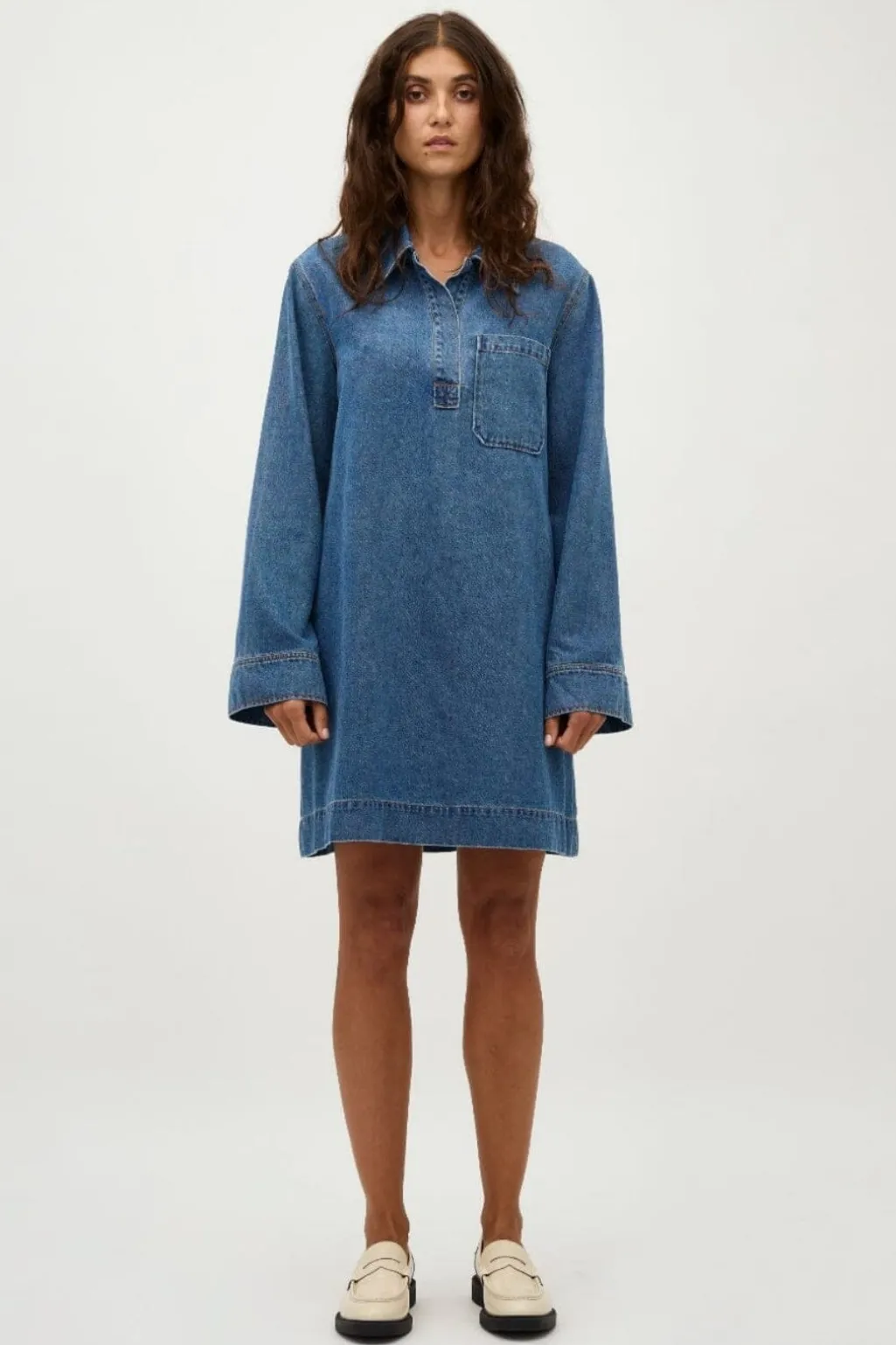 Denimkjole i mid vintage blue med polokrave og lange ærmer. Kjolen har en regular fit og går til midt på låret. De dekorative syninger giver et håndværksmæssigt præg.