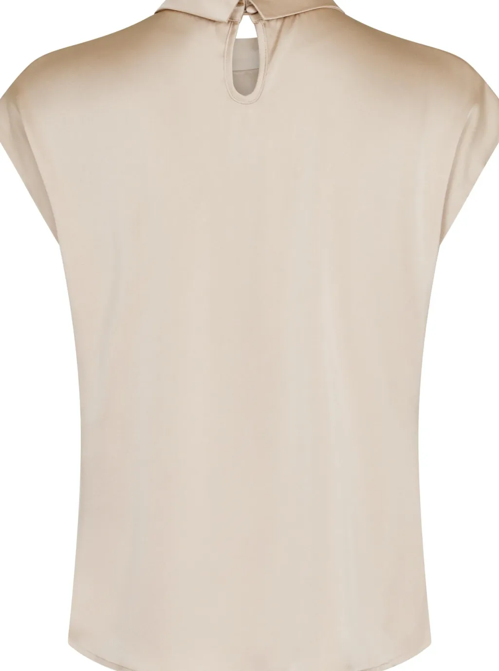 Sandfarvet satinbluse fra Neo Noir med draperet design og plissering. Blusen har høj hals og korte ærmer med en lille åbning i nakken. Den passer til både kontoret og festlige arrangementer.