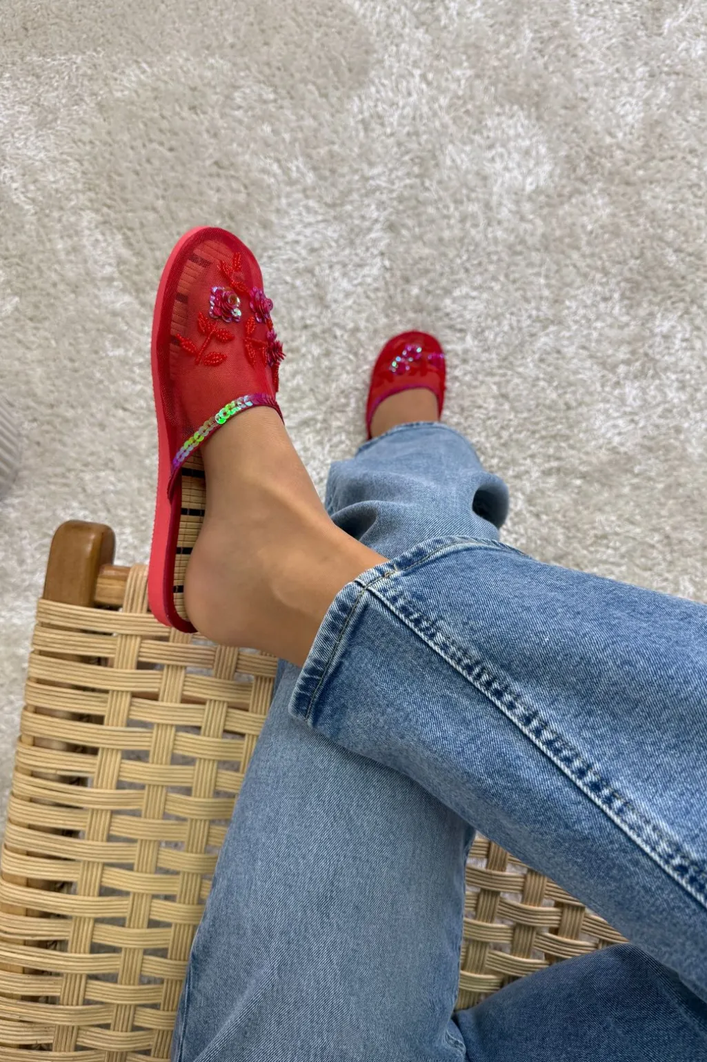Røde slippers fra Mellow Moon med broderede blomster og perler. Disse hjemmesko har en åben tå og lav sål, der gør dem praktiske til både hjemmebrug og casual anledninger.
