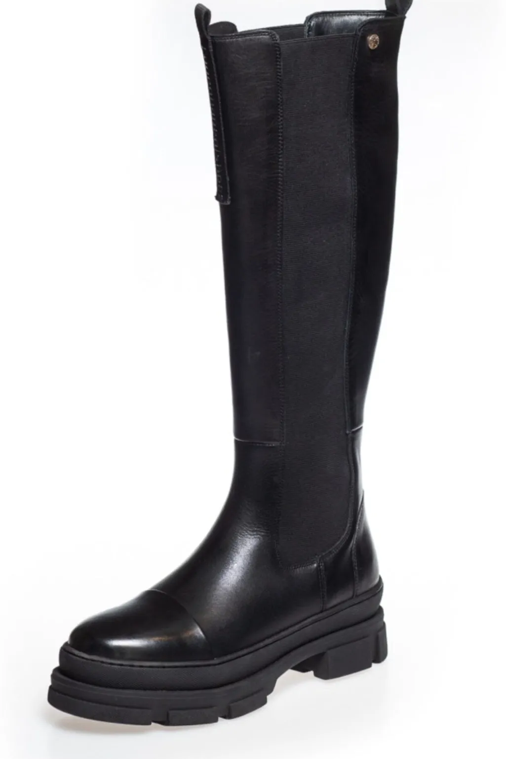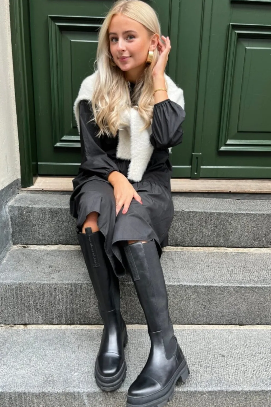 Sorte læderstøvler med dekorative syninger og rund tå. Støvlerne har en chunky TPR-sål og elastik i begge sider af skaftet, hvilket gør dem nemme at tage på.
