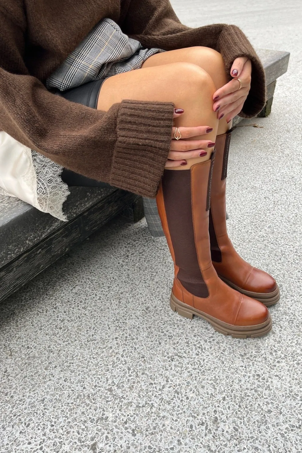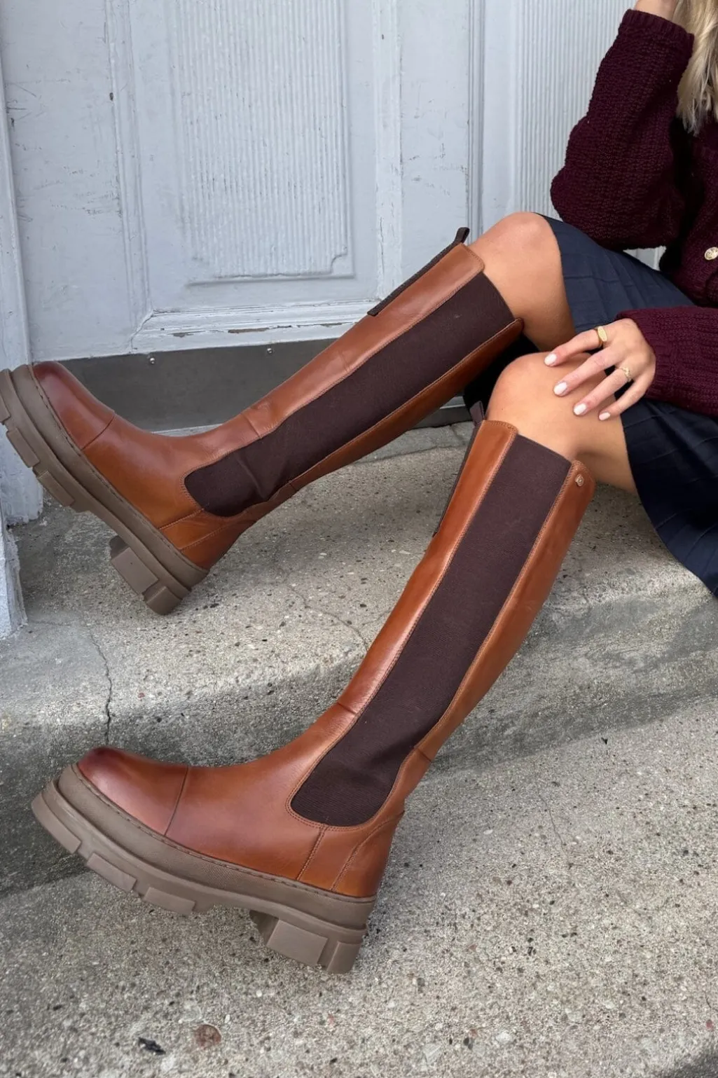 Knæhøje støvler i cognacfarvet læder med mørke elastikpaneler på siderne. TPR-sålen har et chunky design, der giver god støtte til foden.