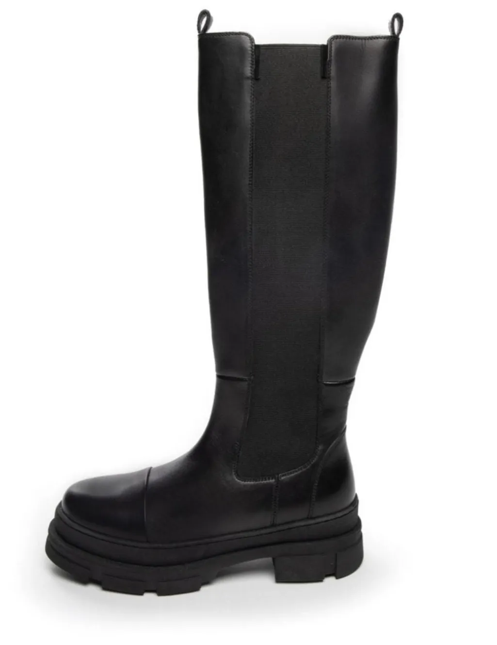 Knæhøje støvler fra Copenhagen Shoes, lavet af sort læder med sorte syninger. Den chunky sål og blokhælen giver støvlerne et markant look.
