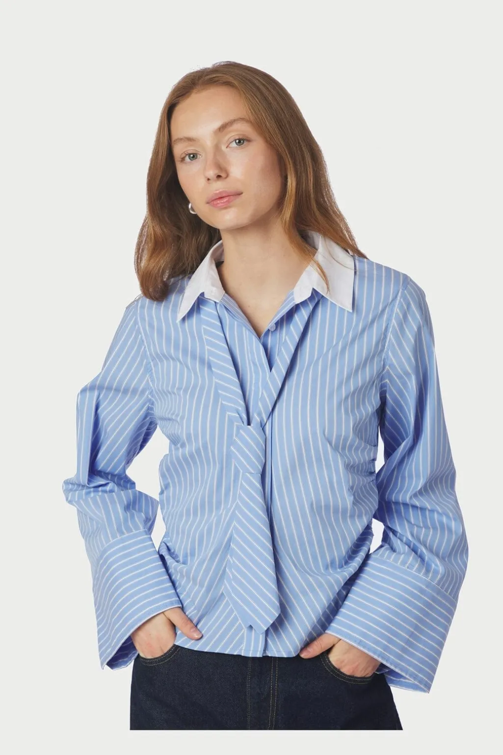 Stribet skjorte fra Neo Noir i lyseblå med hvid krave. Skjorten har et aftageligt slips foran samt rynker i siden og på ryggen.