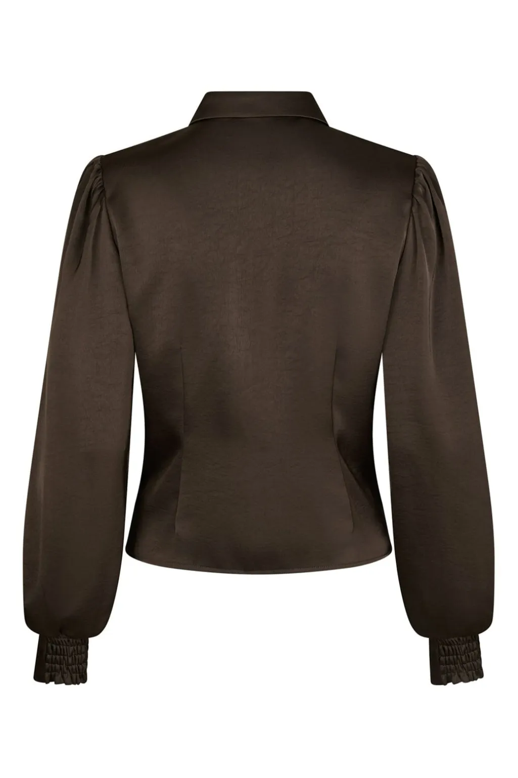 Mørkebrun skjorte fra Neo Noir i sateen med skjortekrave og skjult knaplukning. Skjorten har en slim fit-pasform og puffede ærmer ved skuldrene.