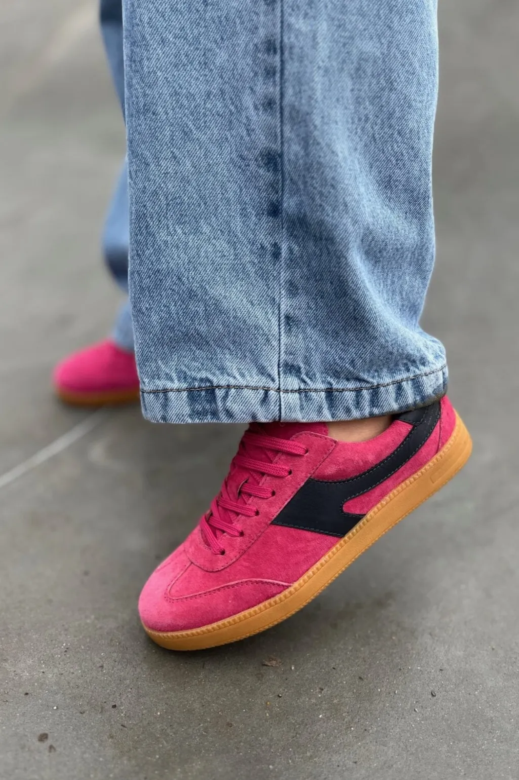 Pink sneakers fra Copenhagen Shoes i ruskind med rund tå og snørebånd. Sneakersne har en lav hæl og gummisål, der gør dem praktiske til både hverdag og fest.