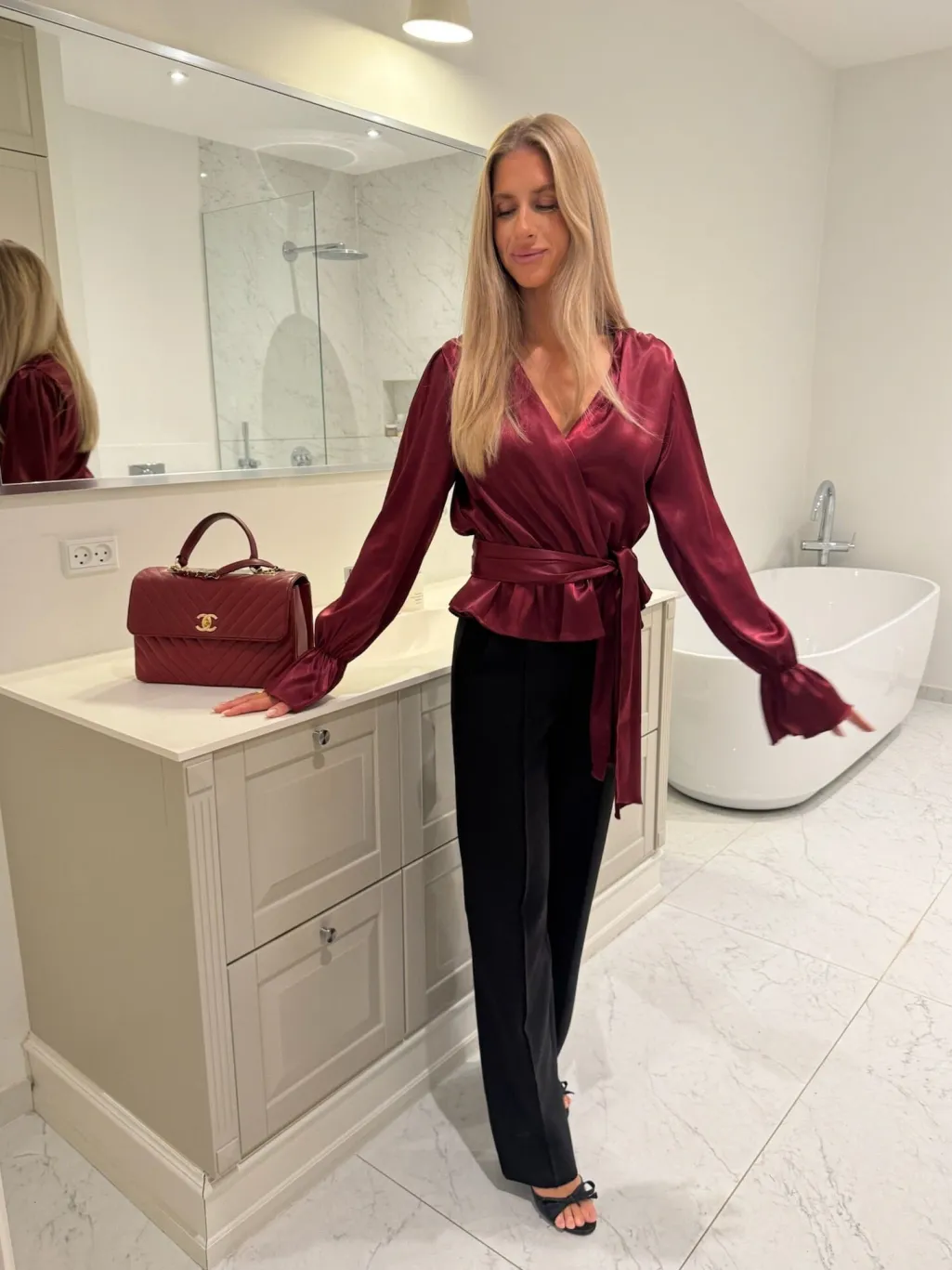Bordeauxfarvet skjorte fra BYIC i skinnende satin. Skjorten har en dyb V-udskæring med bindebånd ved halsen og flæsekant langs kanten.